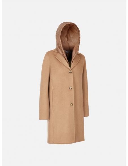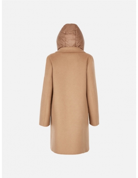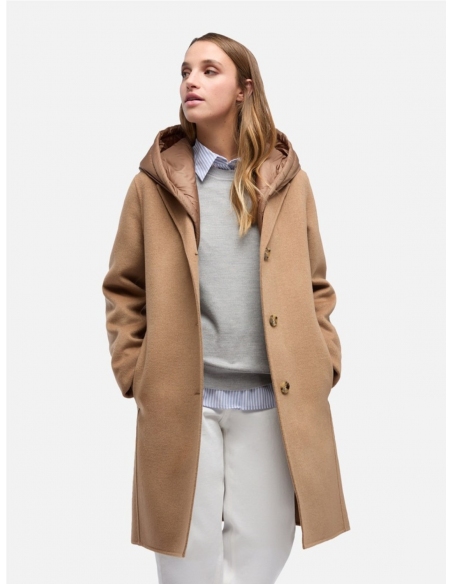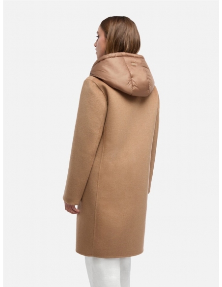 Abrigo largo para mujer con cuello con solapas que combina diseño moderno y funcionalidad para los días en la ciudad. Este modelo, de un cálido color marrón medio, ha sido realizado con un suave paño doble de mezcla de lana y cuenta con una práctica capucha acolchada desmontable.