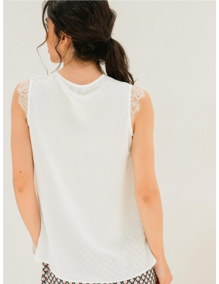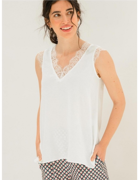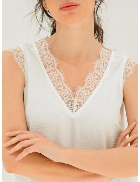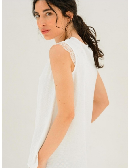 Top lencero fluido con detalles de encaje. Tejido suave y ligero. Corte recto y holgado. Escote en pico con detalle de encaje a tono. Mangas sisas con encaje a juego con el cuello. Bajo recto con terminaciones redondeadas y aberturas laterales. Diseñado y fabricado en España.