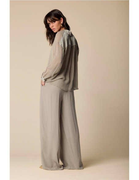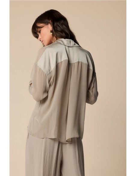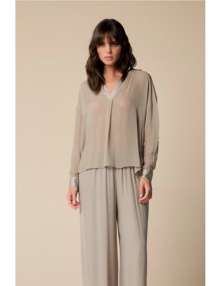 Elegante blusa con inserciones de tejido brillante en hombros, puños y escote. La prenda presenta un escote en pico y un corte holgado. Composición 100% VISCOSA
