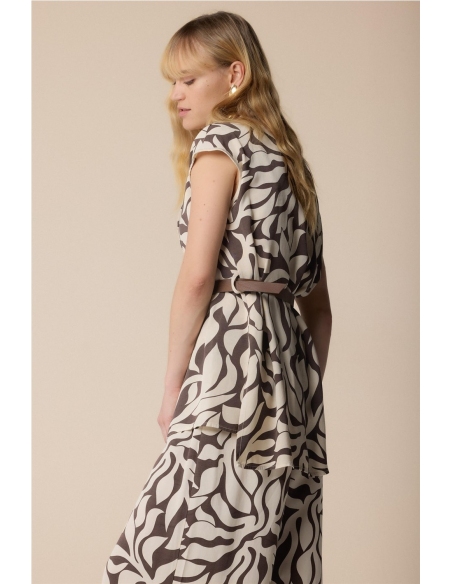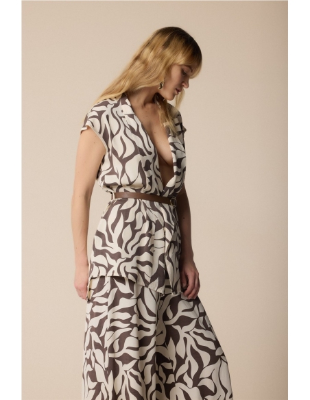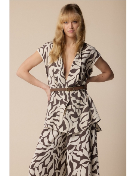 Elegante blusa estampada con escote en V profundo que realza la silueta, cinturón con trabillas en cintura y manga corta. Composición 95% VISCOSA 5% LINO