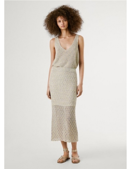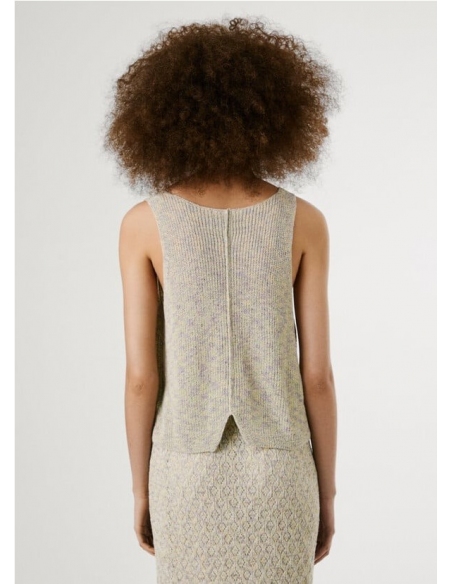 Top de punto sin mangas con cuello en V y abertura completa en la parte delantera, en tejido multicolor. Composición: 53 % poliéster, 21 % algodón, 13 % nailon, 5 % lino, 5 % rayón, 3 % hilo metálico.