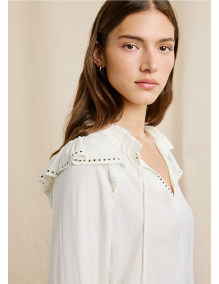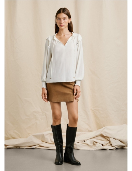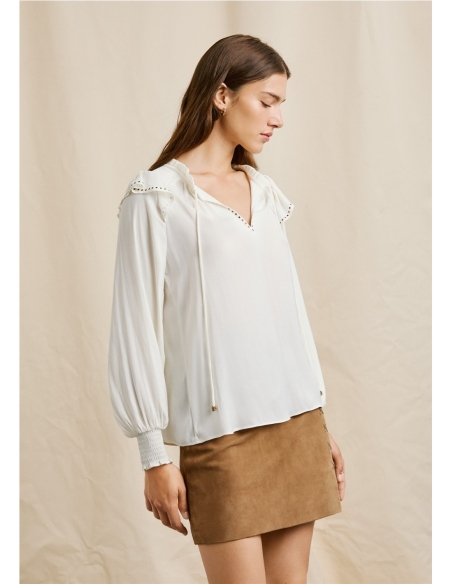 Esta camisa de Pepe Jeans es una prenda versátil ideal para cualquier ocasión. Ofrece un tejido ligero y fluido que garantiza comodidad durante todo el día. Su diseño incorpora manga larga con puños clásicos, detalles fruncidos en los hombros y un delicado volante en la parte superior, aportando un toque femenino y sofisticado. El cuello con cordón ajustable permite adaptar el look según la ocasión, mientras que los apliques de tachuelas le añaden un aire moderno y distintivo.