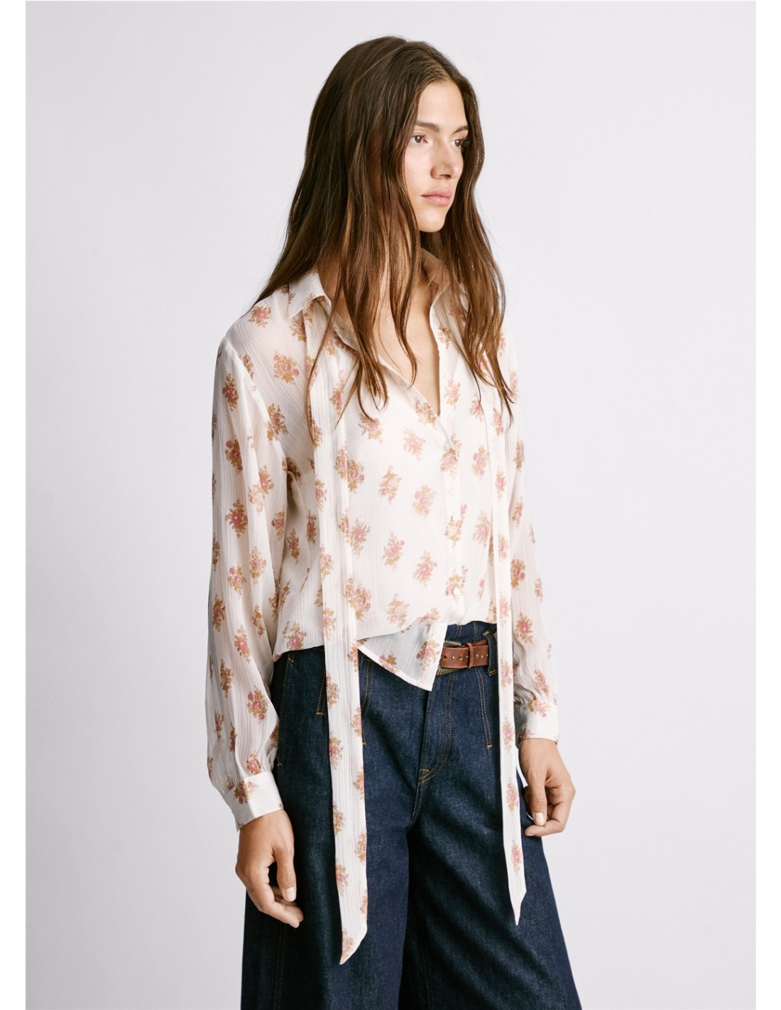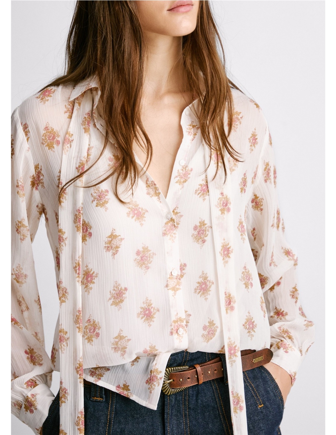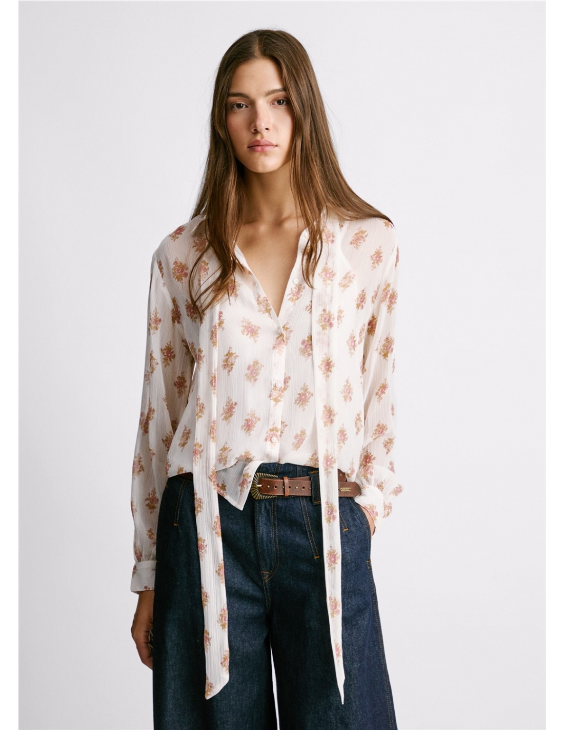 - Blusa en tejido ligero de chifón arrugado - Cuello camisero con lazo ajustable - Cierre frontal abotonado - Manga larga ligeramente abullonada - Estampado floral all over - Puños ajustables con botón
