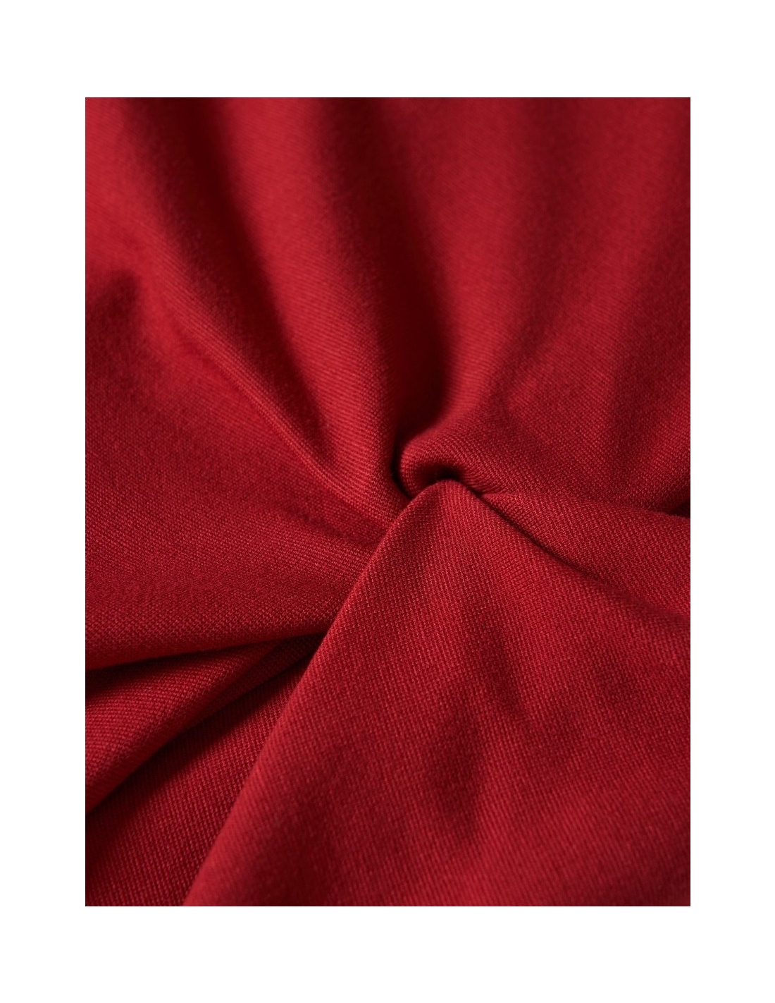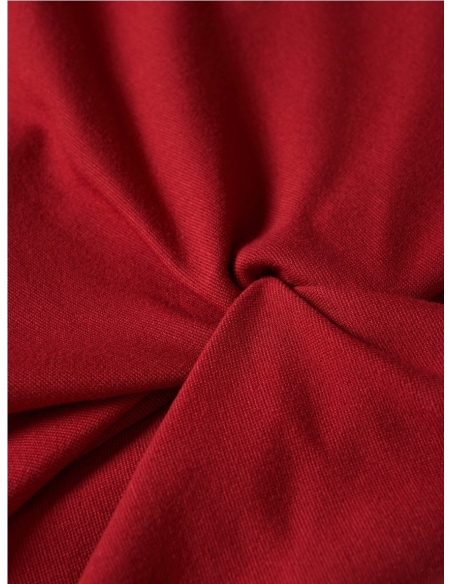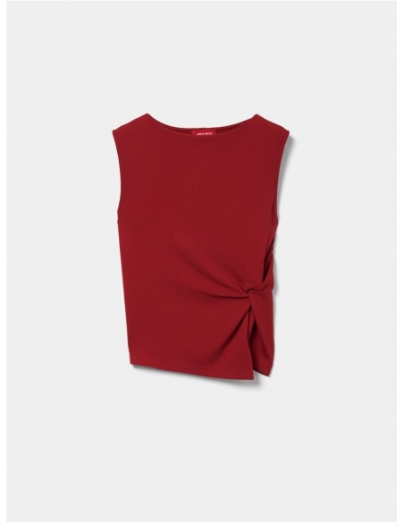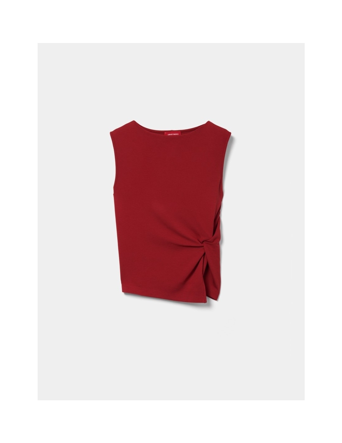 Top sin mangas de cuello redondo. El modelo destaca por el efecto de nudo decorativo en la cintura, que crea un drapeado sofisticado y moderno. Una pieza versátil y cómoda, ideal para completar un look de verano.