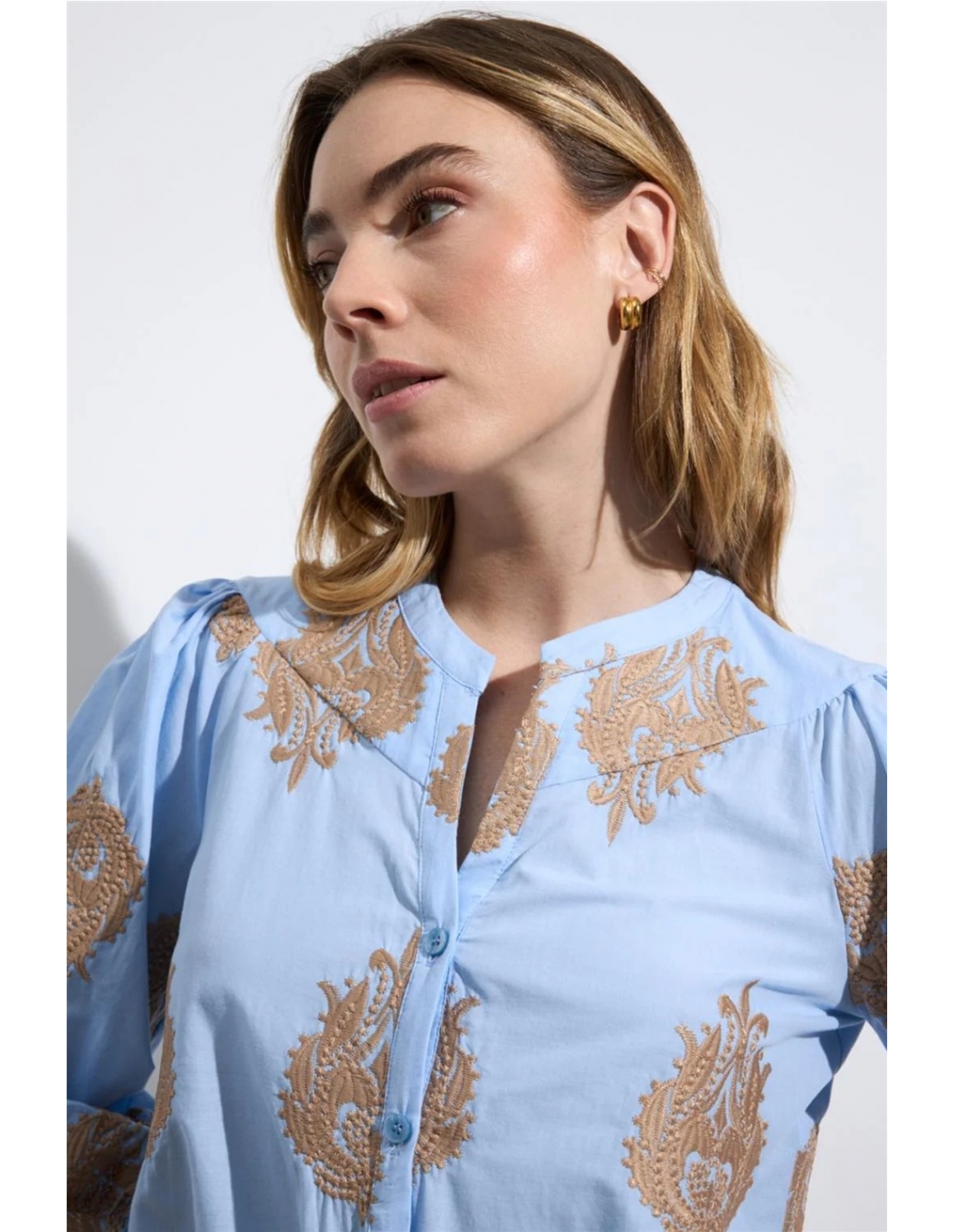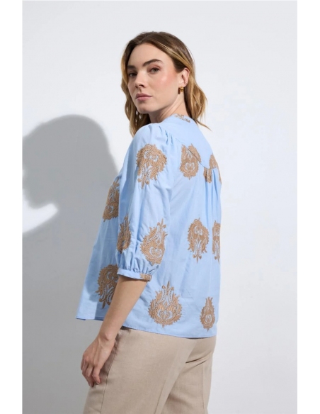 Blusa de manga tres cuartos abullonada. Cuello mao. Bordados ornamentales de gran tamaño en contraste. Escote en V. Cierre frontal de botones. Bajo recto. Diseñado y fabricado en España.