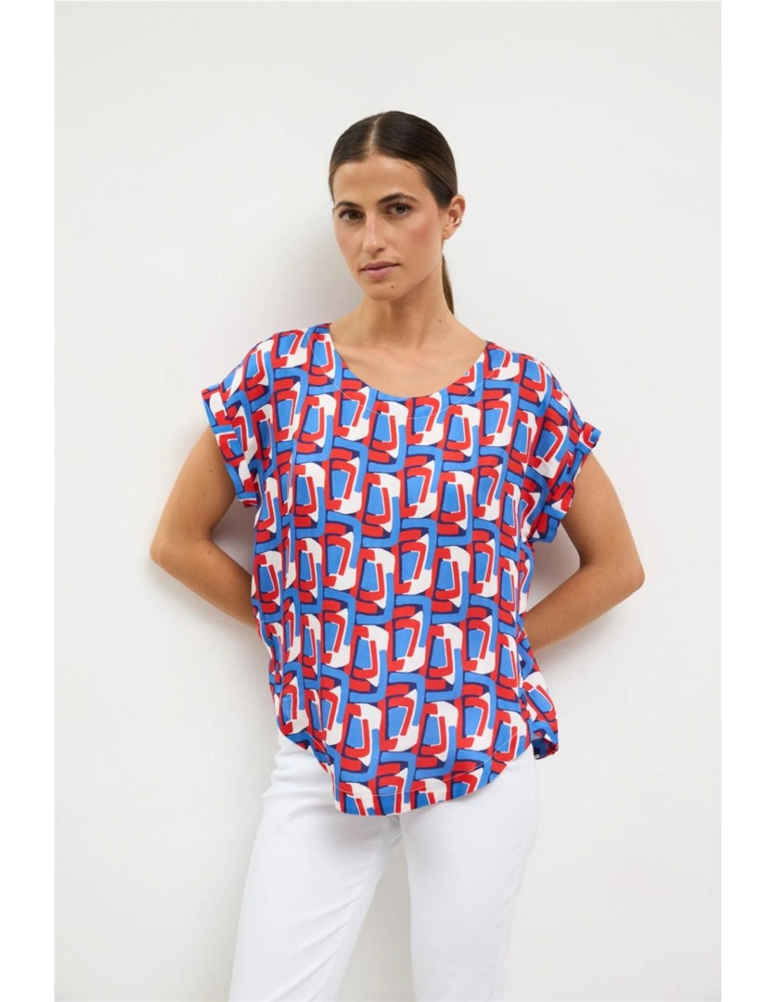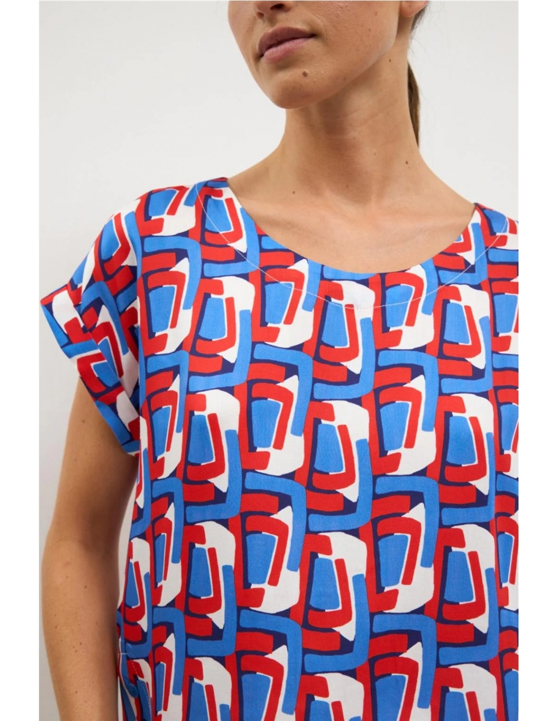 Blusa de manga corta amplia. Cuello redondo. Estampado geométrico abstracto. Escote redondo. Bajo redondeado y asimétrico. Diseñado y fabricado en España.