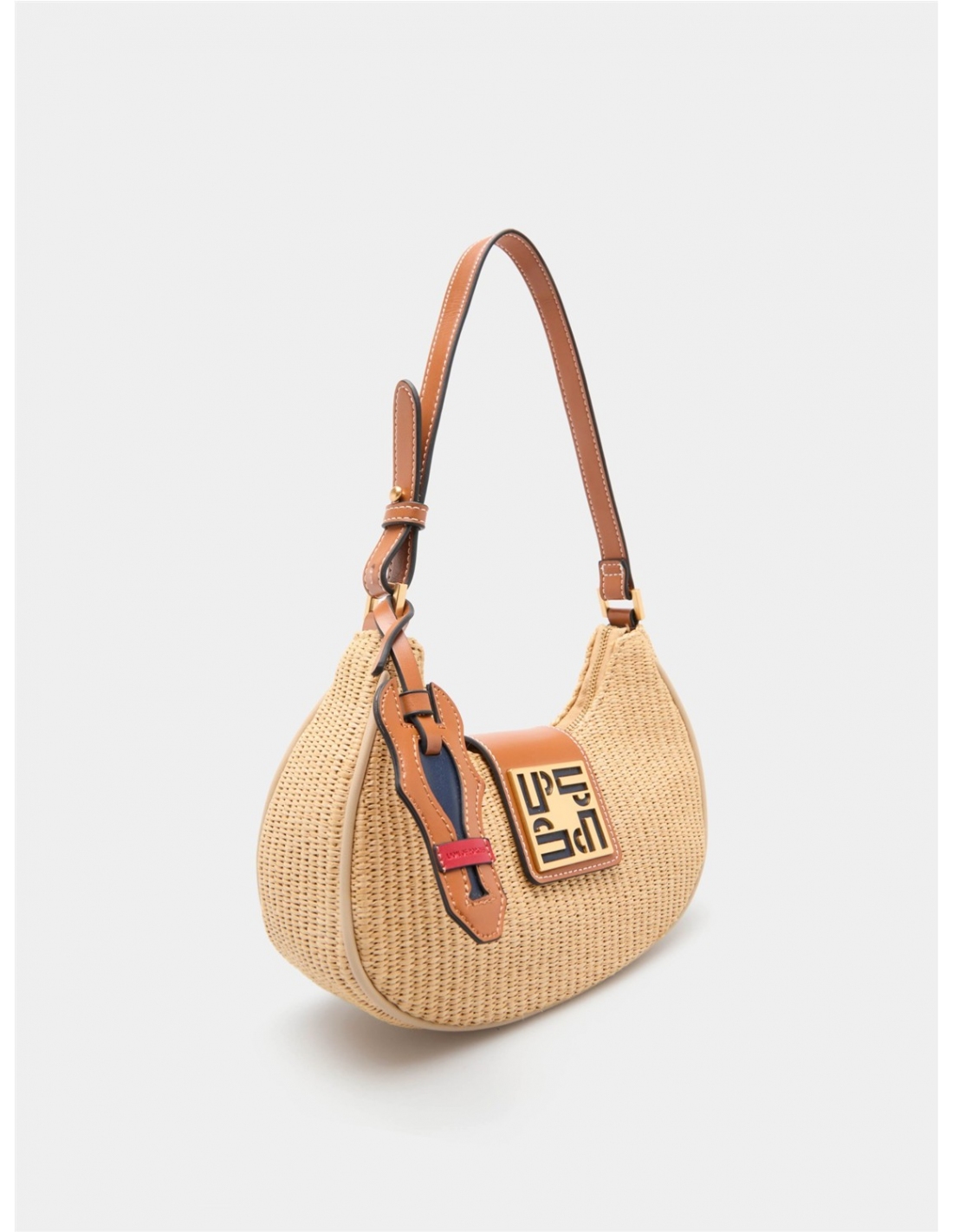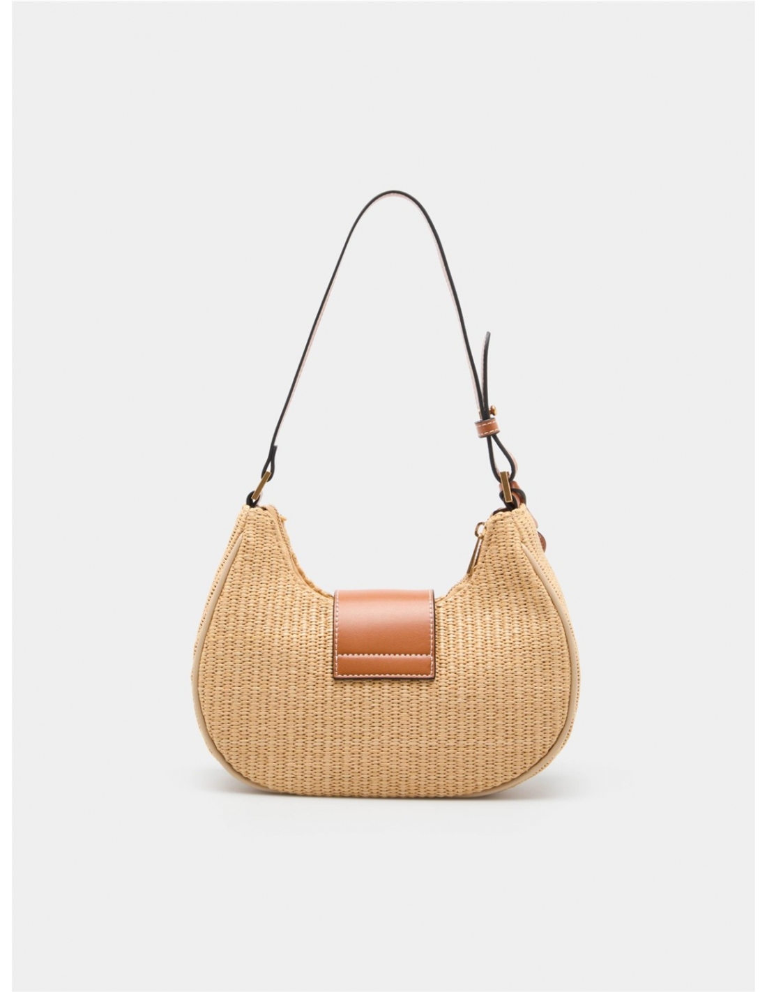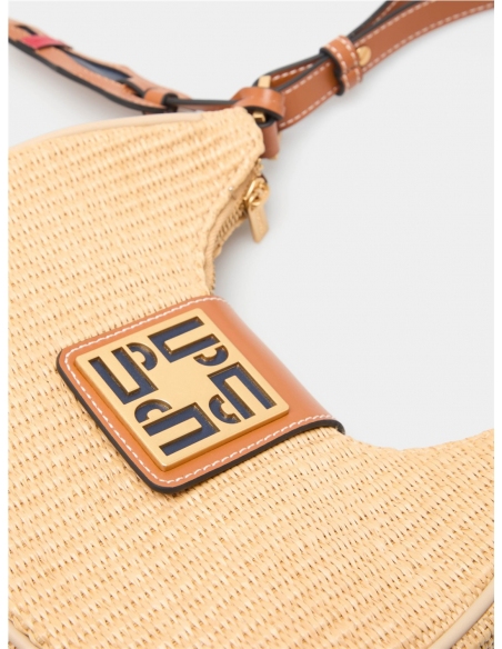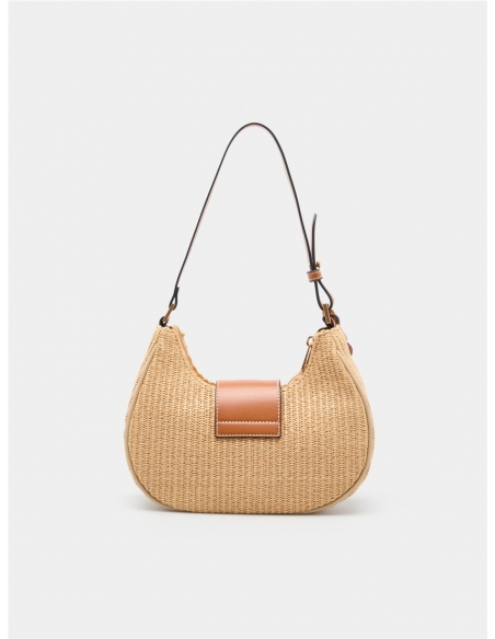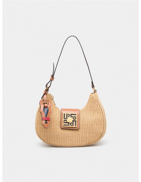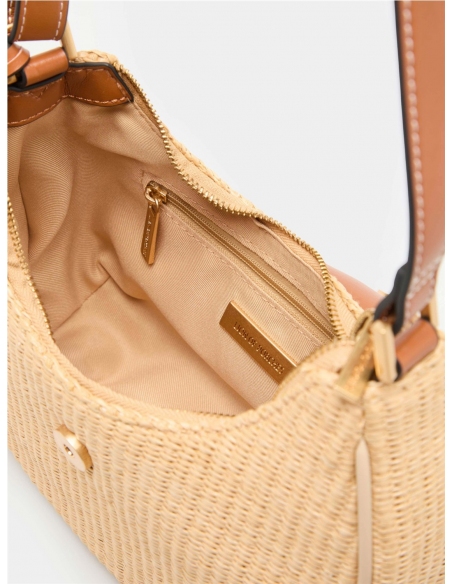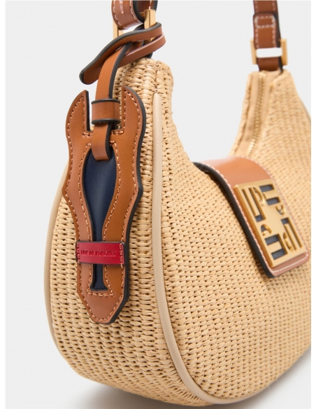Bolso de hombro estilo hobo en efecto rafia trenzada negra, con un diseño contemporáneo. Se cierra con cremallera y una solapa magnética con el detalle del monograma de la marca. Presenta un asa de hombro ajustable y un colgante charm decorativo. Medidas: 24.5cm x 19cm x 9cm