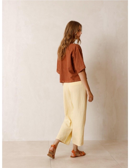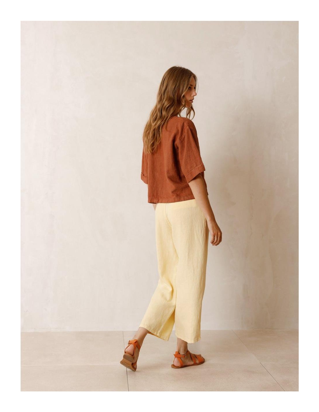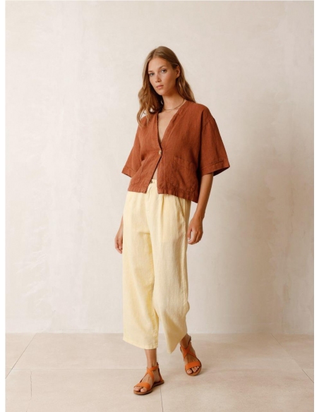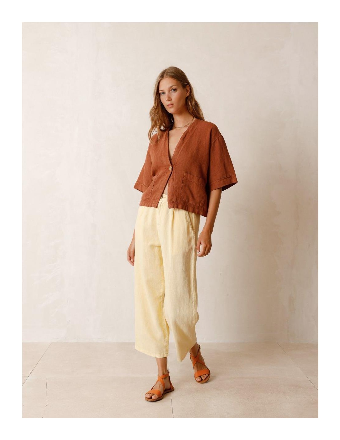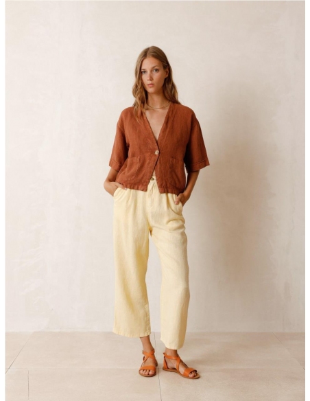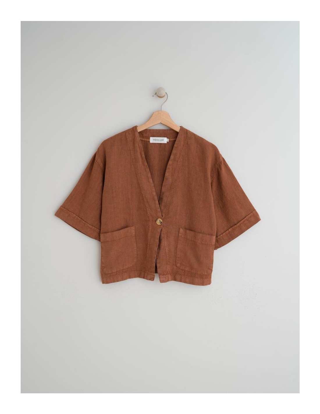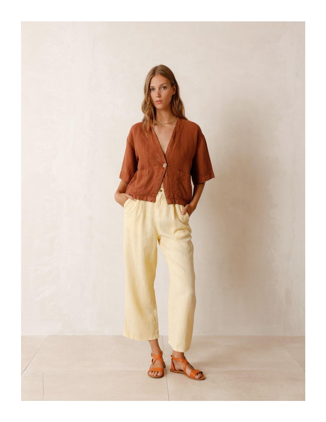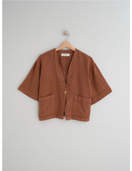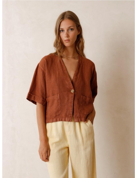 - Cuello acabado V con hombro caído y manga japonesa - Cierre de botón en el delantero - Bolsillos plastrón en el delantero - Tejido de lino 100% y tinte en prenda - Relaxed fit - Made in Spain 100% LINEN WOVEN