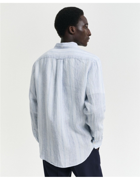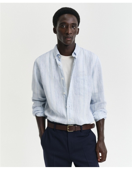Hecha 100 % de lino, una fibra naturalmente transpirable y ligera, esta camisa de corte regular tiene un aspecto impecable que la hace ideal para eventos veraniegos elegantes e informales. Confeccionada con un estampado integral de rayas finas, presenta cuello abotonado, dobladillo curvo, un bolsillo en el pecho con el logotipo bordado y un pliegue cuadrado con trabilla en la espalda. Una prenda versátil que combina a la perfección con todo, esta camisa es un básico de verano.