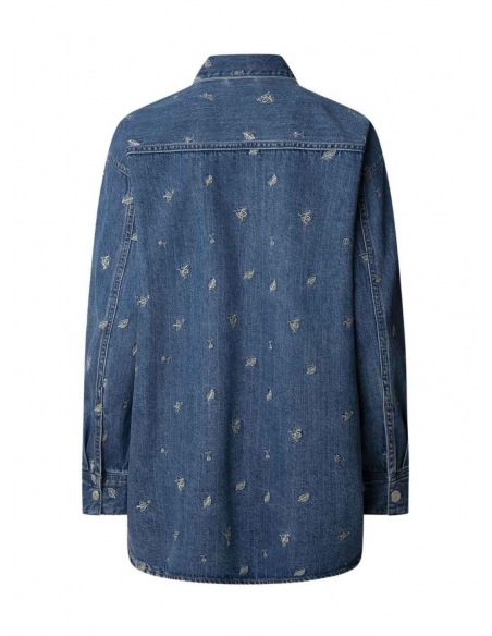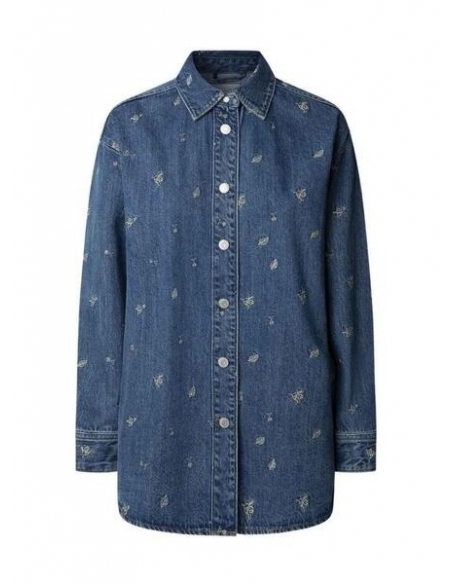 Sobrecamisa Pepe Jeans. Modelo Blossom. Denim medio. Cierre con botones metálicos de presión. Ajuste holgado. Corte largo. Tejido con flores bordadas.