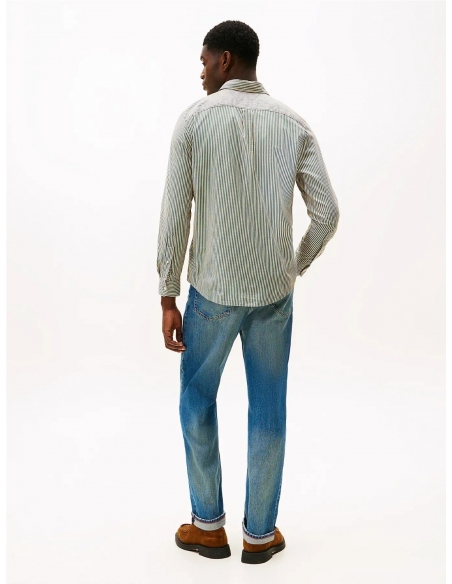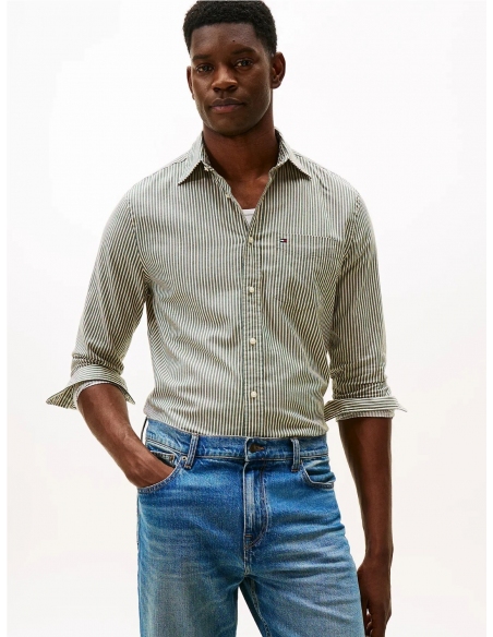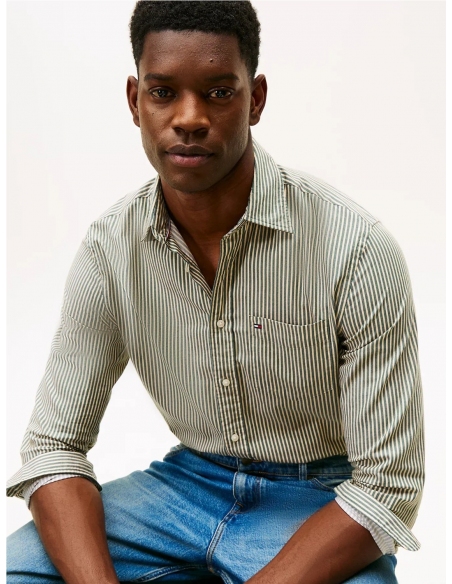 Esta elegante camisa a rayas está confeccionada en sarga de algodón mercerizado puro de primera calidad y luce un bordado de bandera en el práctico bolsillo del pecho.