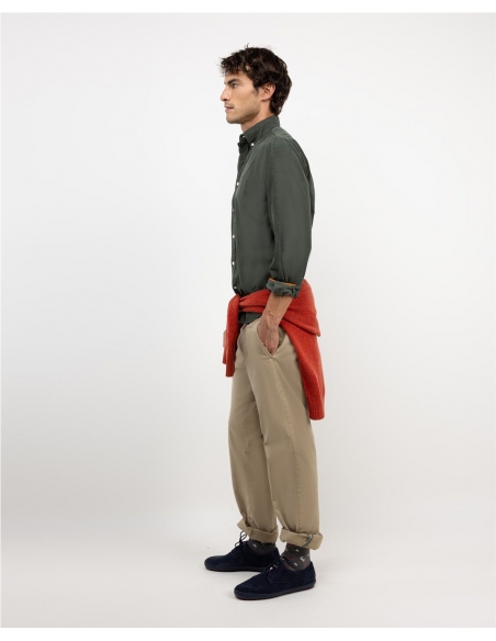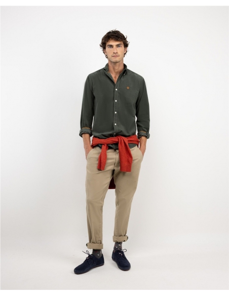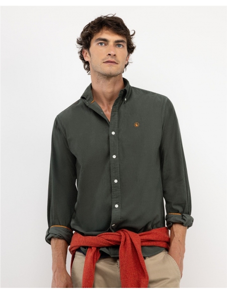 Camisa micropana de hombre confeccionada en tejido 100% algodón con lavado enzimático para darle mayor suavidad y color desgastado. Corte Regular Fit, cuello botón y cierre con botones y tapeta. Manga larga terminada en puño simple. Detalle de vivo liso en interior de cuello y puños. Logo bordado en el pecho.