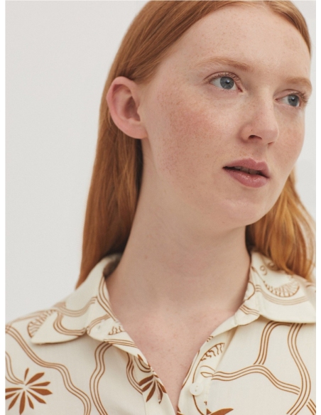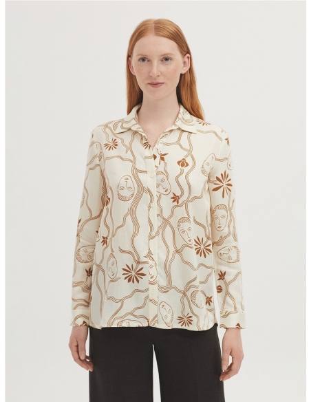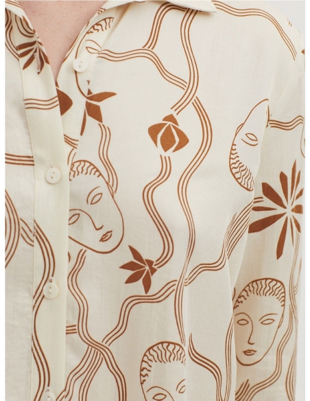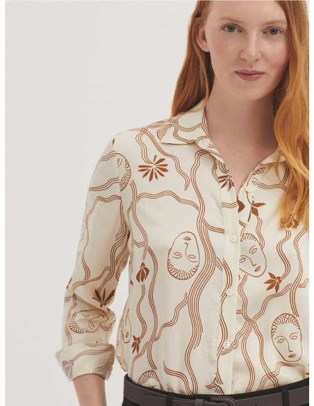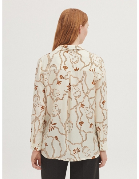 Camisa satinada en tejido Tencel con estampado Muses Garden. Cuello camisero y botonadura frontal. Canesú y pliegue en la parte trasera. Manga larga con abertura, puño y botón.