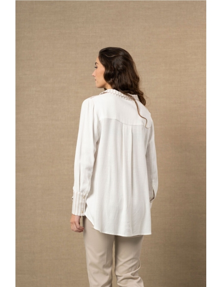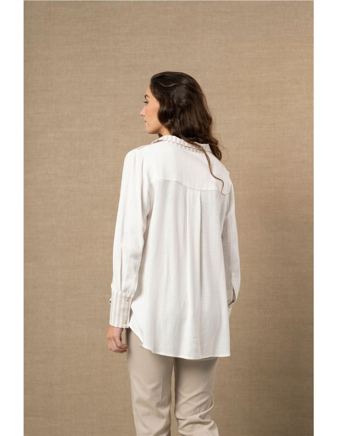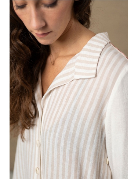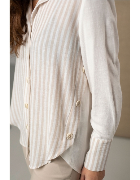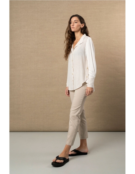 Suave, ligera y con un aire natural. Esta camisa de rayas en tono beige combina un delantero estampado con una espalda lisa en color claro, creando un contraste sutil que aporta interés al look sin recargarlo. Su silueta fluida y el tejido ligero la convierten en una prenda cómoda para el día a día, ideal para combinar con pantalones claros, vaqueros o prendas en tonos neutros. El juego de rayas verticales estiliza visualmente la figura.