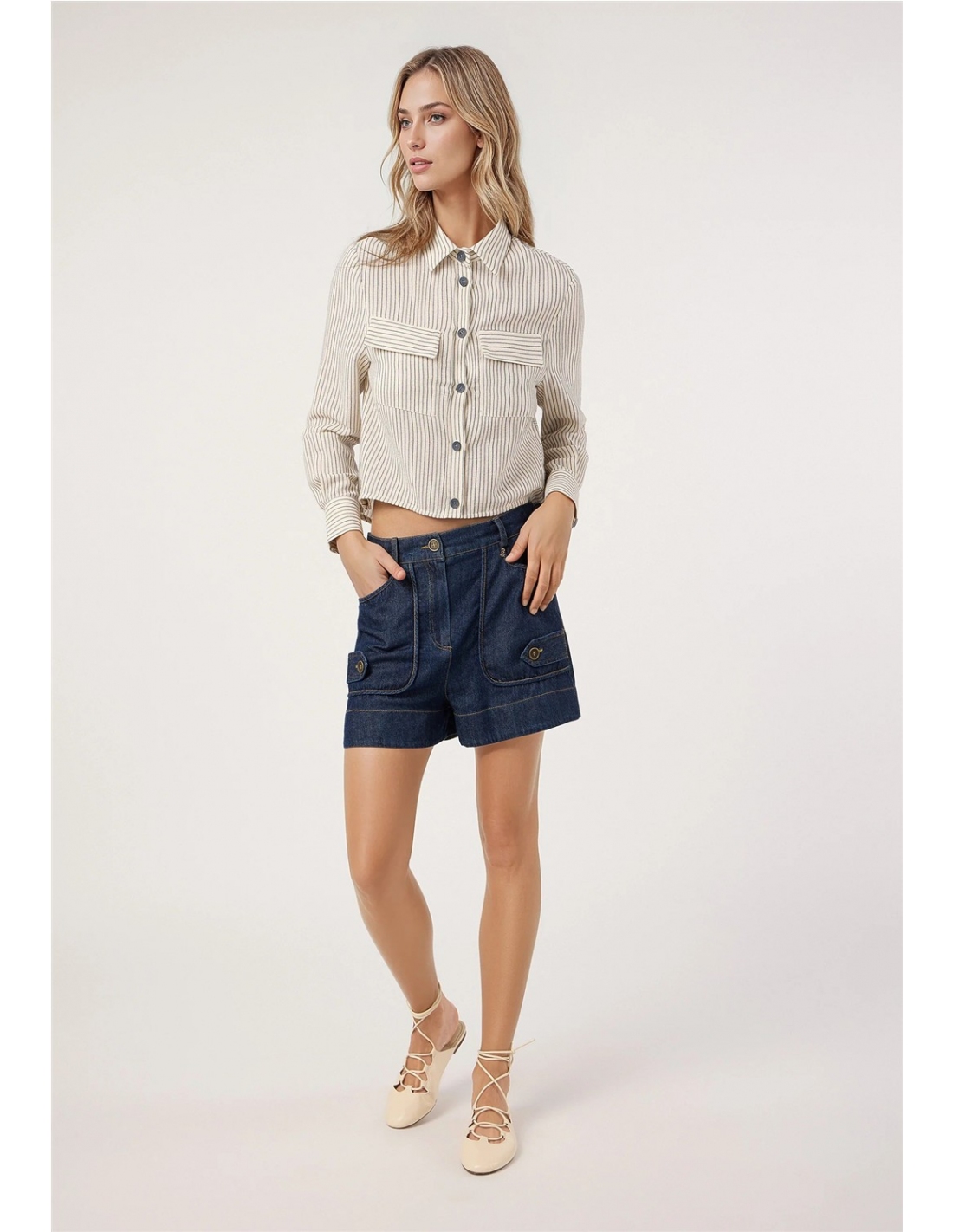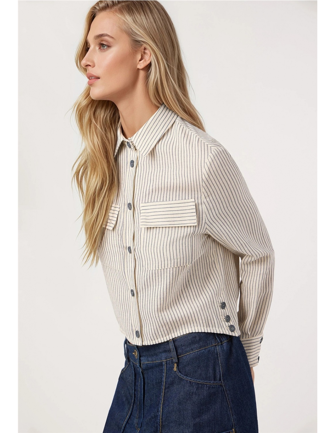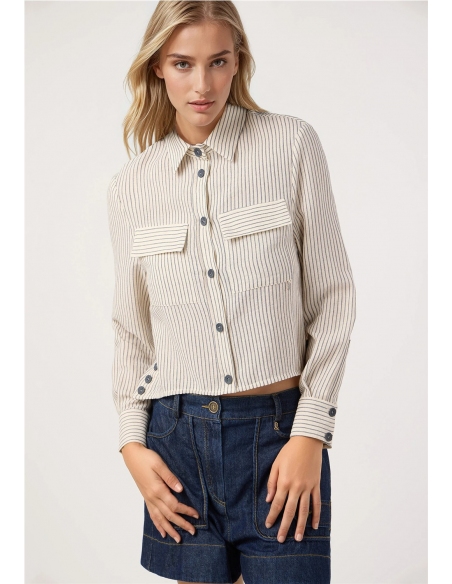 Camisa de mujer confeccionada en tejido listado de aspecto ligero y tacto suave. Presenta cuello camisero, cierre frontal con botones y bolsillos superiores con solapa que aportan un aire utilitario. Su corte recto y ligeramente corto moderniza el diseño, perfecto para combinar con denim o pantalones de tiro alto para un estilo casual y actual.