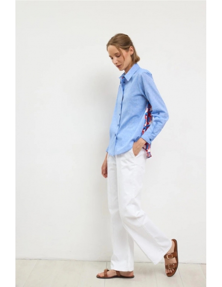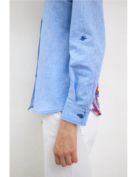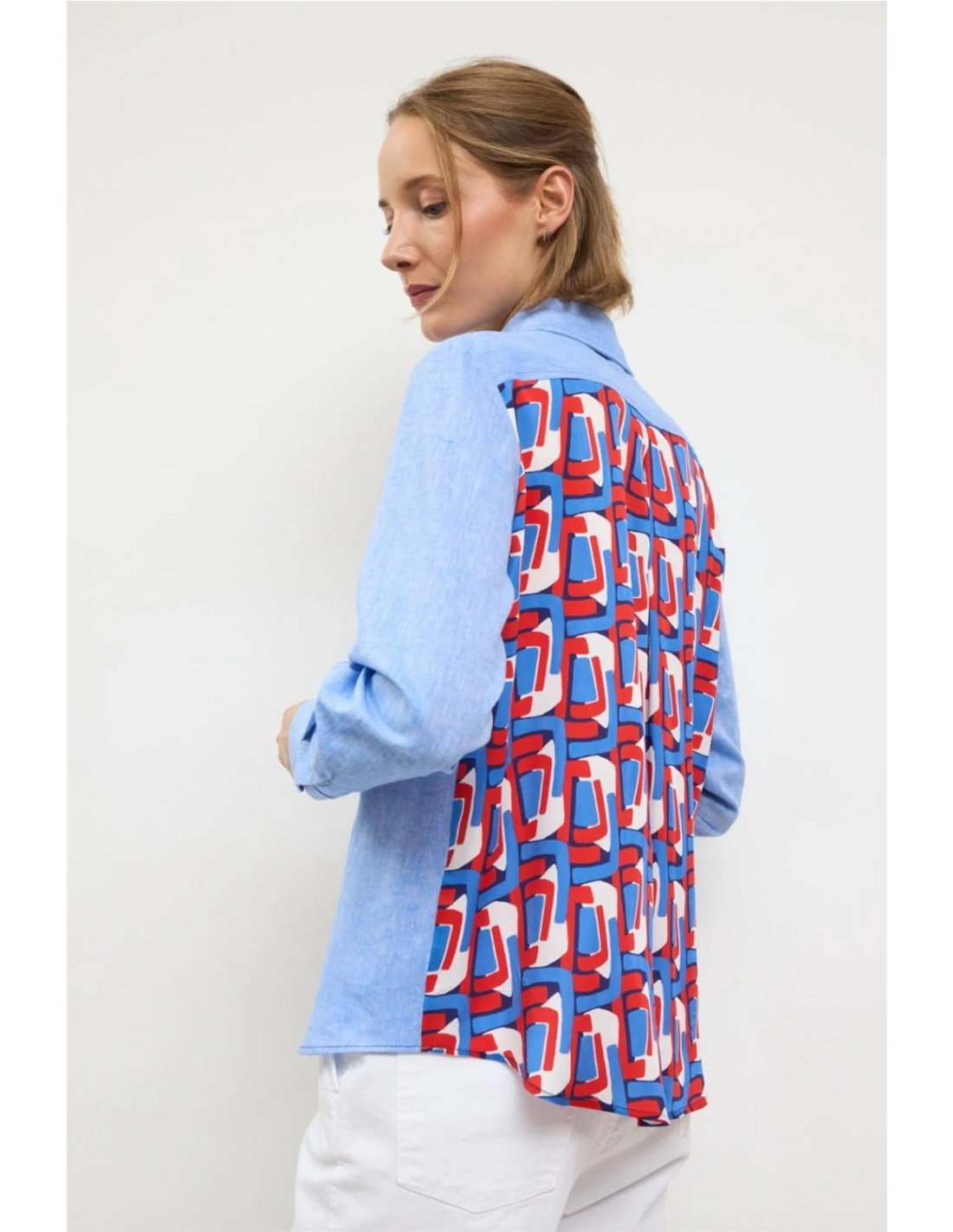 Camisa con estampado en la espalda. Manga larga con puño abotonado. Cuello camisero clásico. Espalda a contraste con estampado geométrico multicolor y canesú. Cierre frontal de botones. Bajo redondeado. Diseñado y fabricado en España.