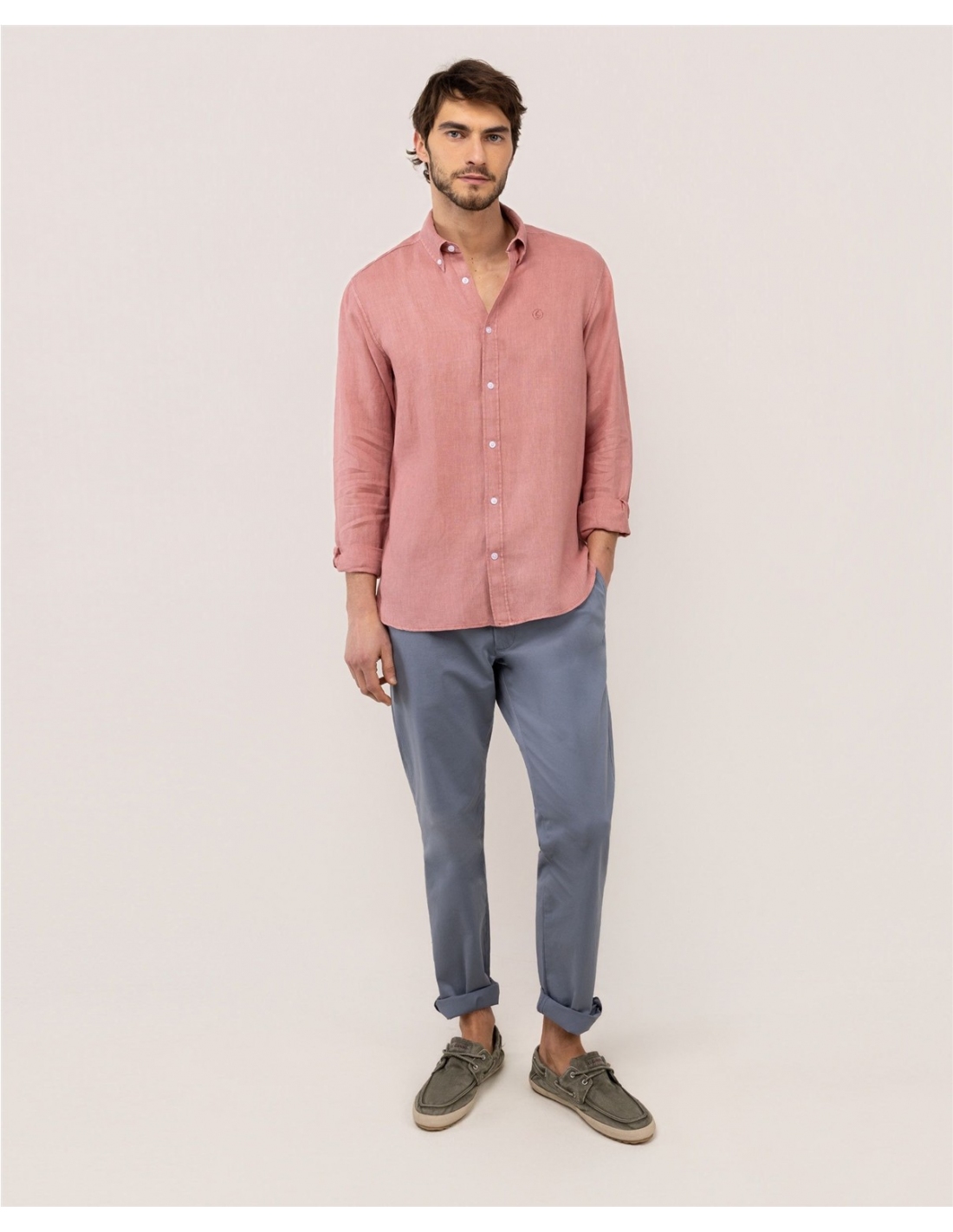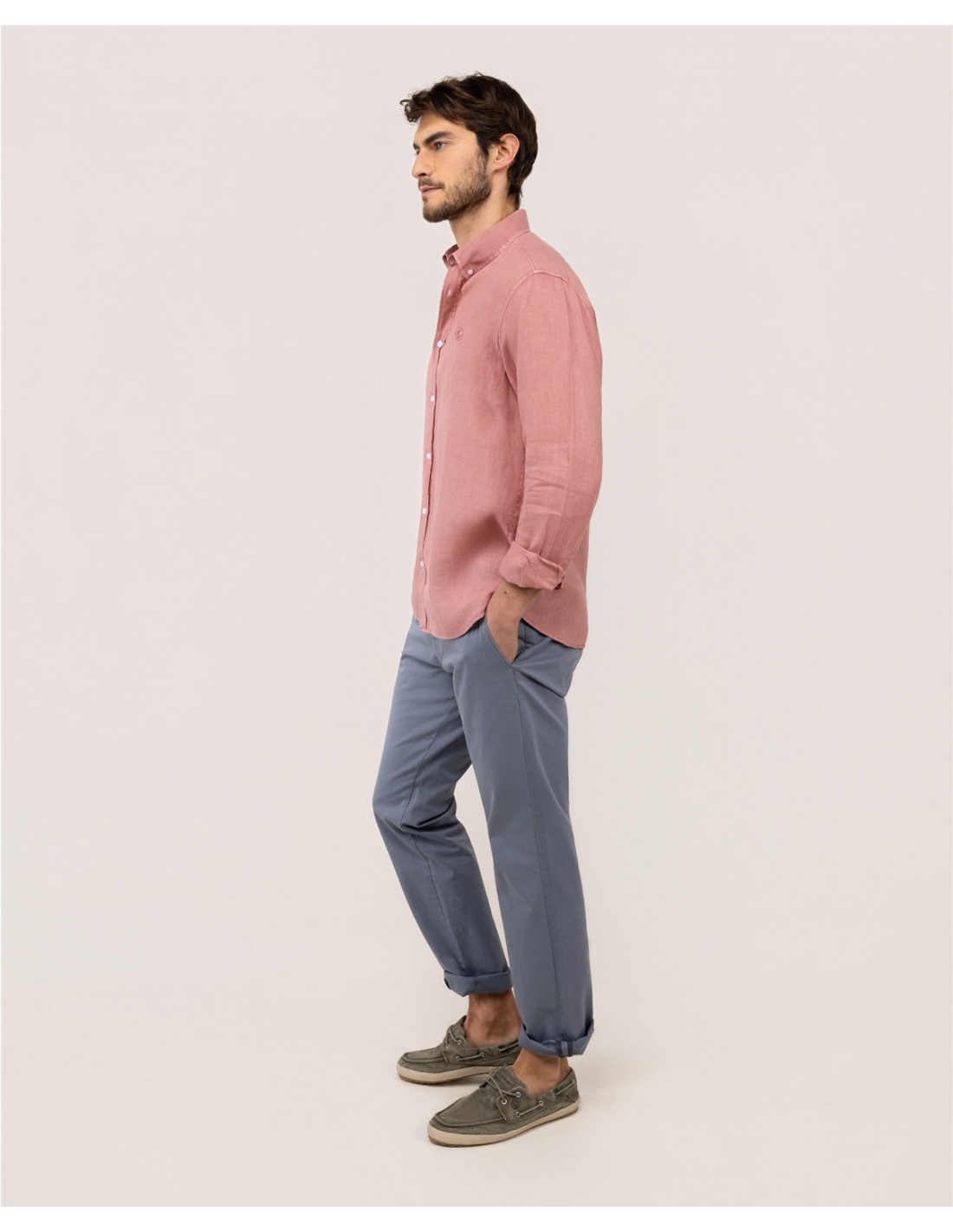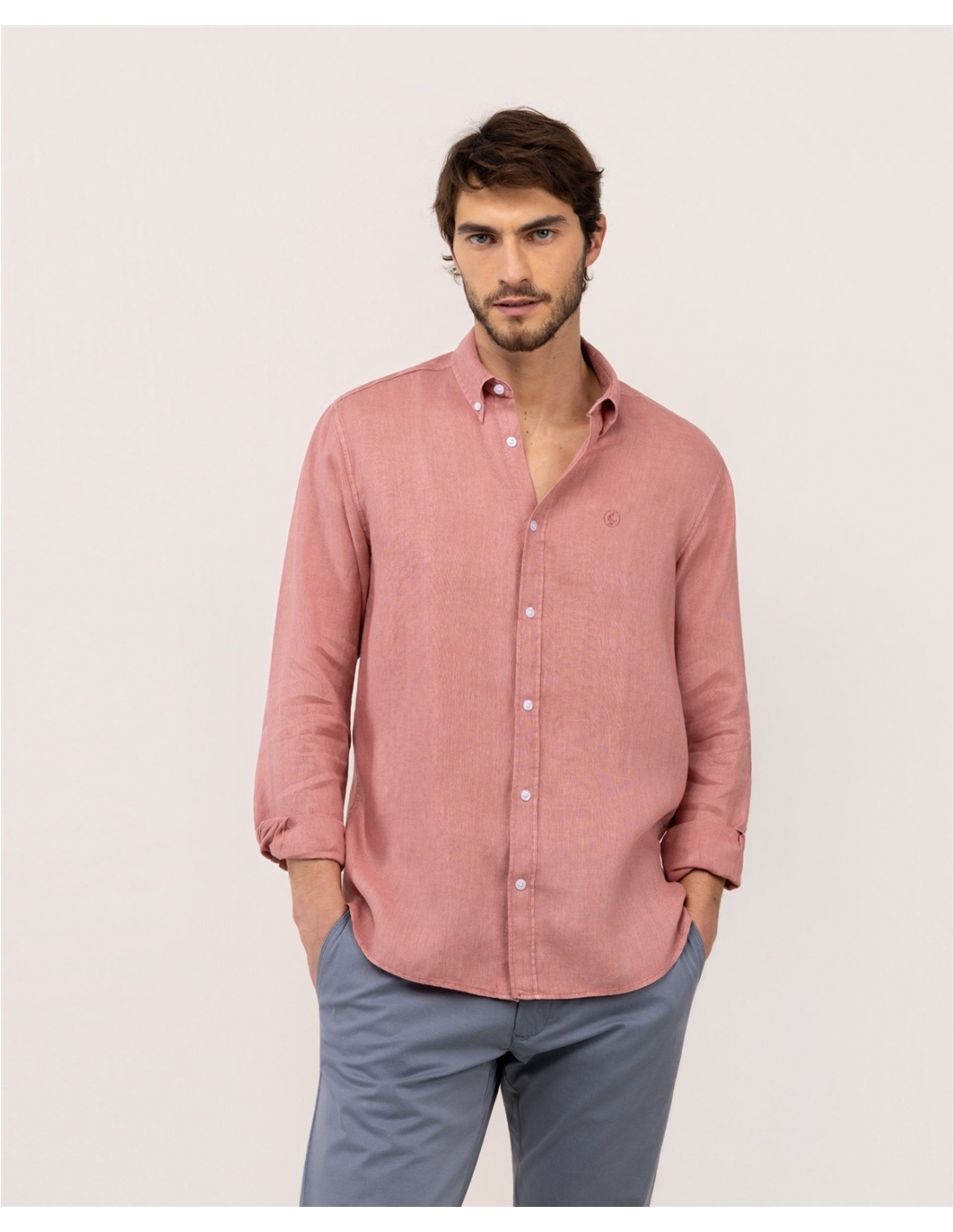 Camisa lisa de hombre confeccionada en lino, tintada en prenda envejecida para darle un acabado vintage. Corte Regular Fit, cuello buttondown y cierre con botones. Manga larga terminada en puño simple y logo en el pecho bordado.
