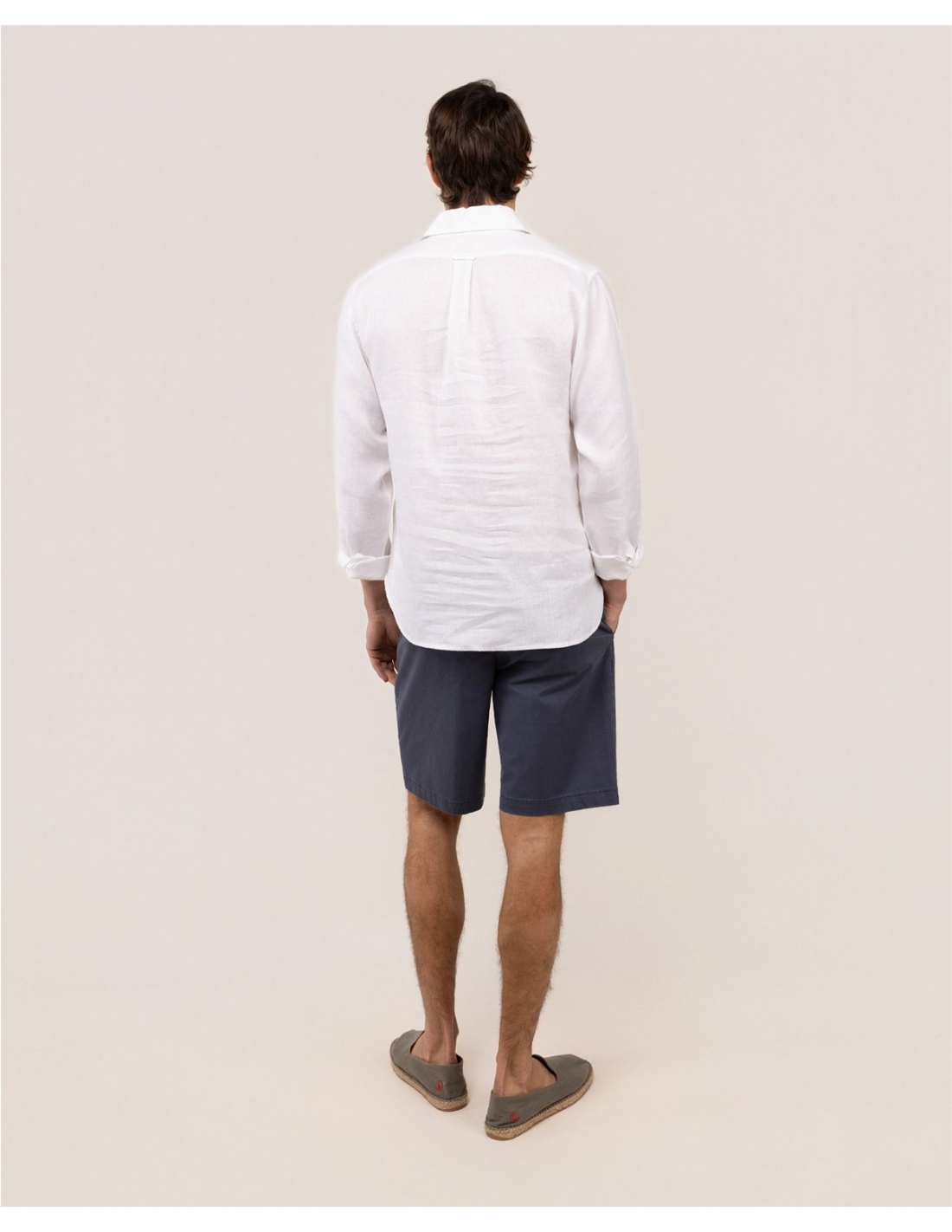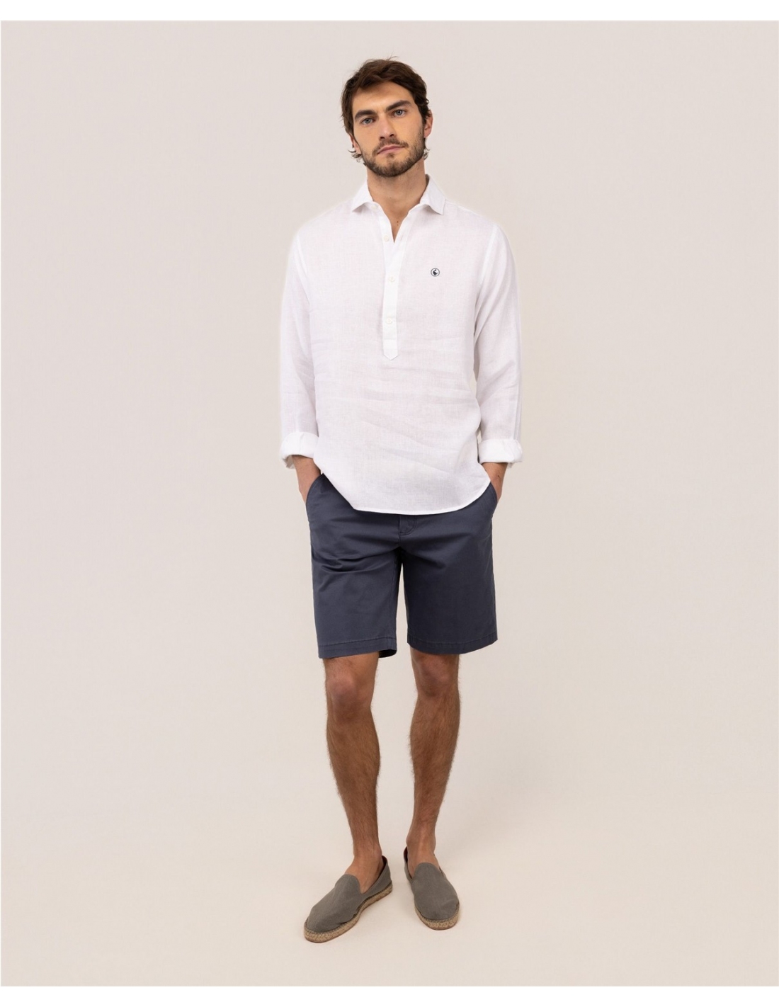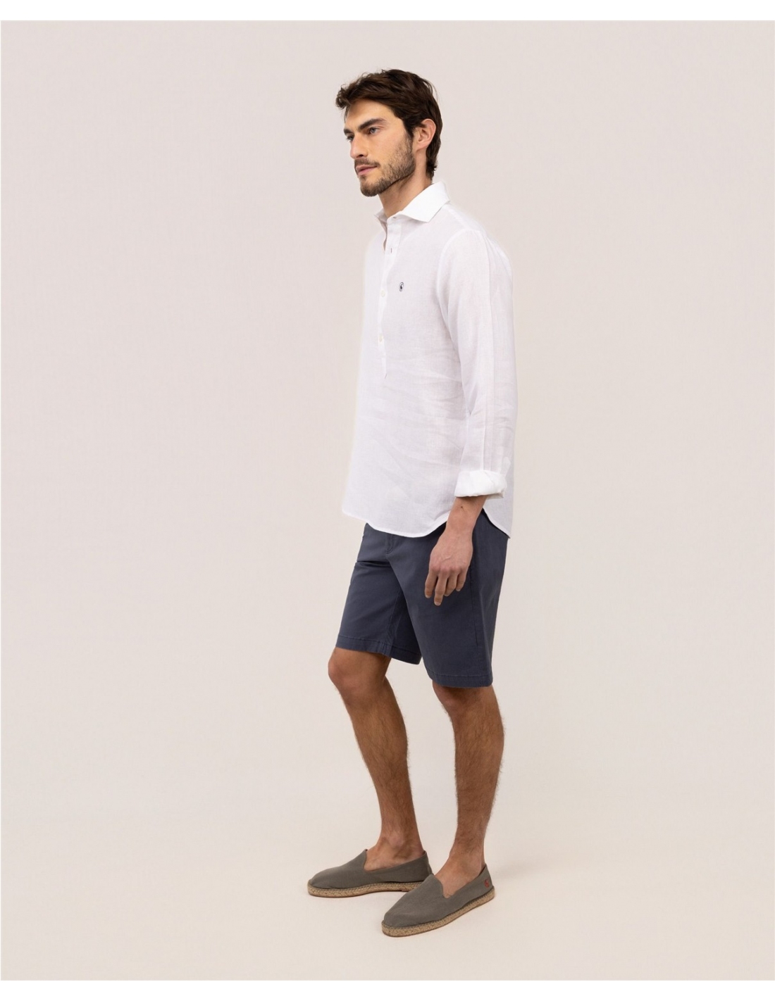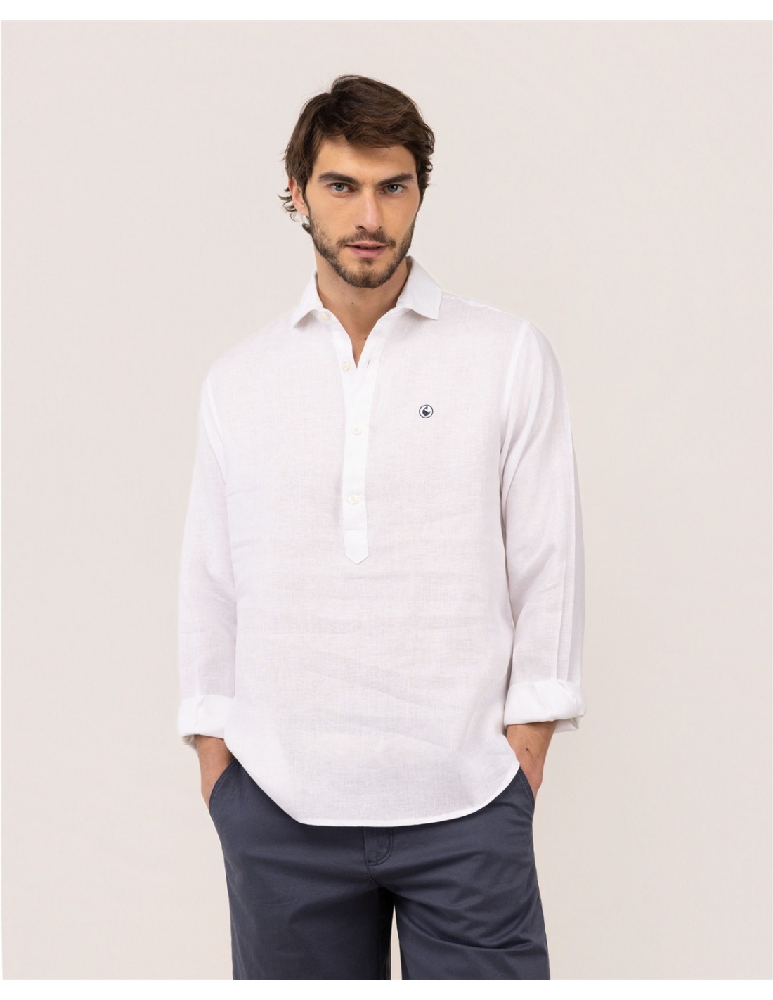 Camisa de hombre lisa confeccionada en tejido 100% lino. Estilo polera, corte Regular Fit, cuello italiano y cierre con botones y tapeta. Manga larga terminada en puño simple. Logo bordado en el pecho.
