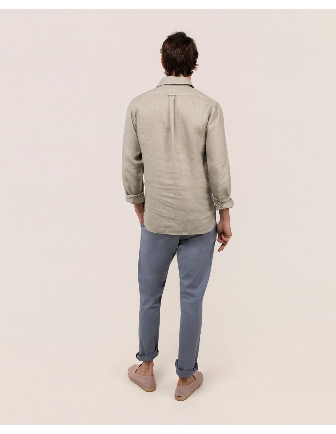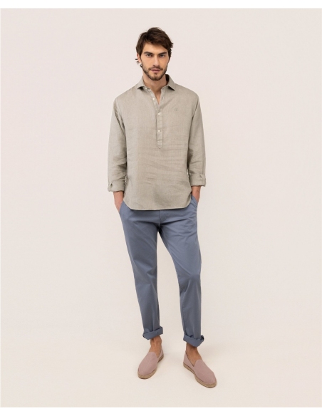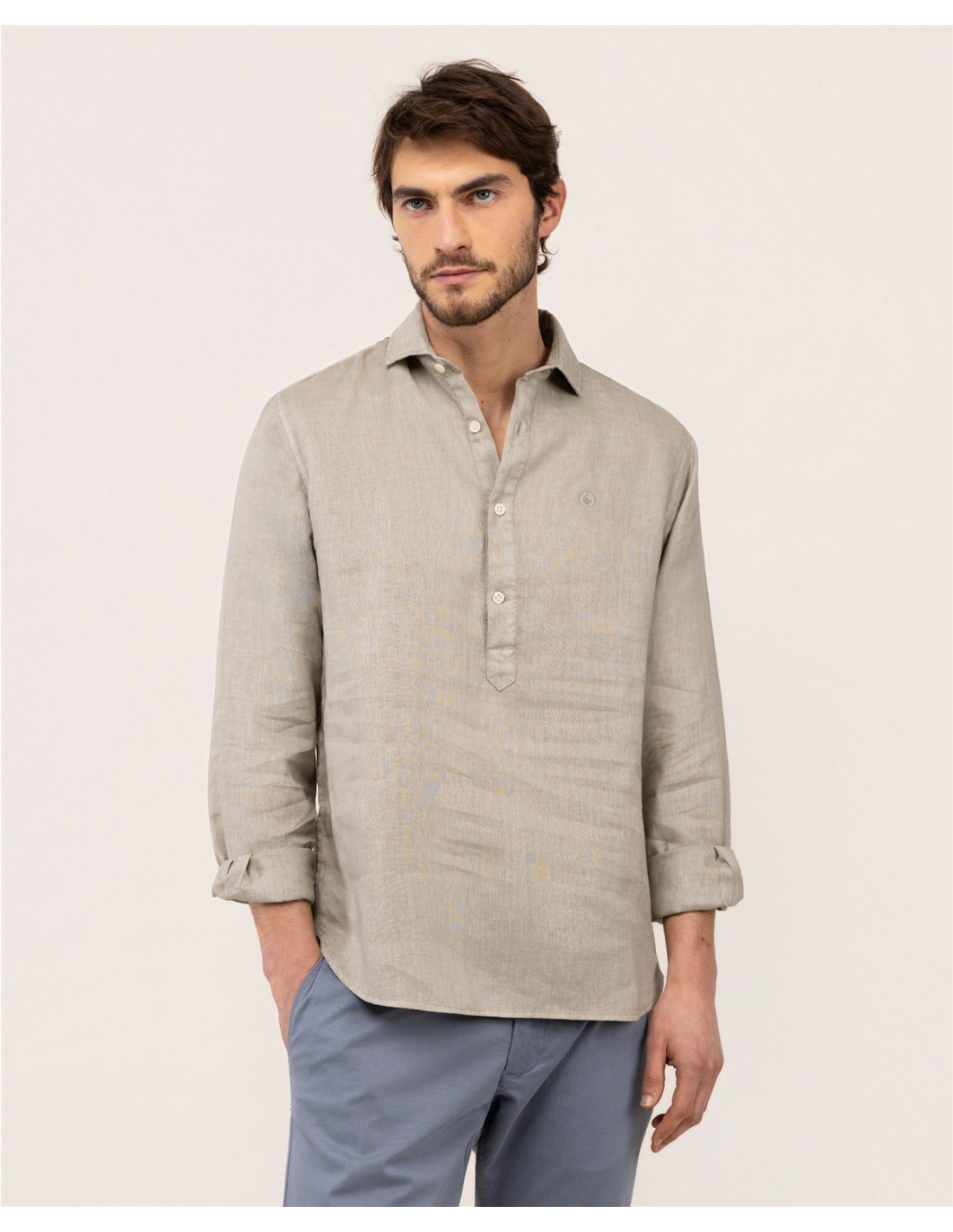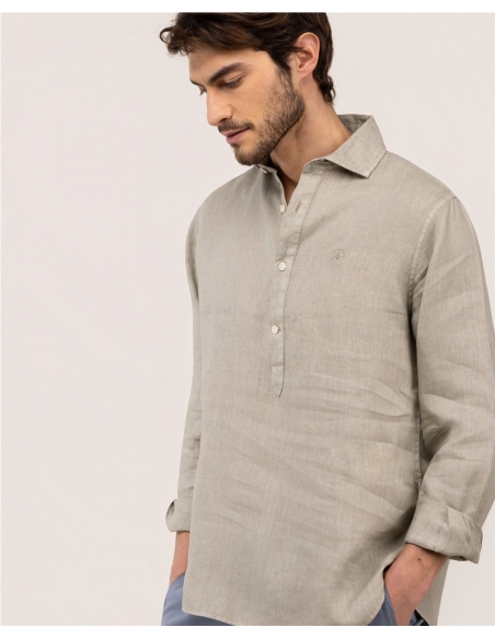 Camisa de hombre lisa confeccionada en tejido 100% lino. Estilo polera, corte Regular Fit, cuello italiano y cierre con botones y tapeta. Manga larga terminada en puño simple. Logo bordado en el pecho.