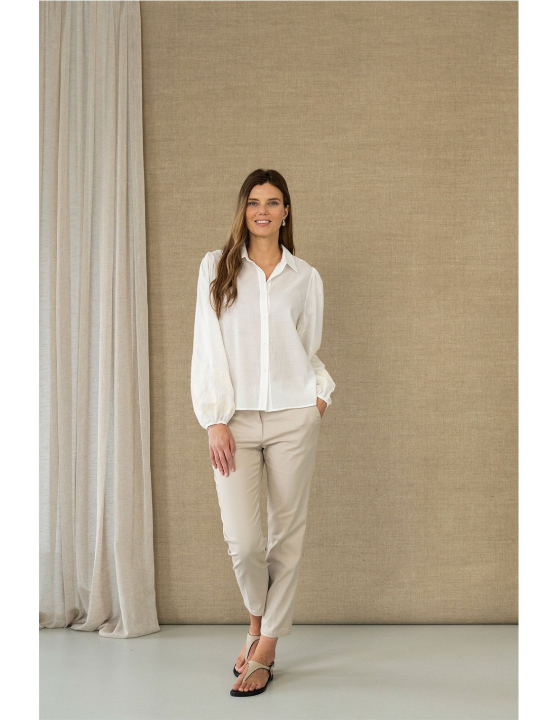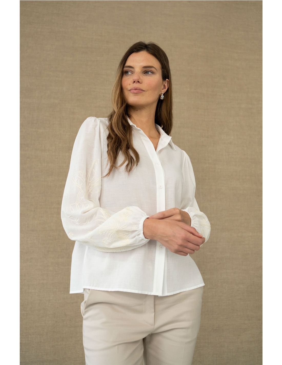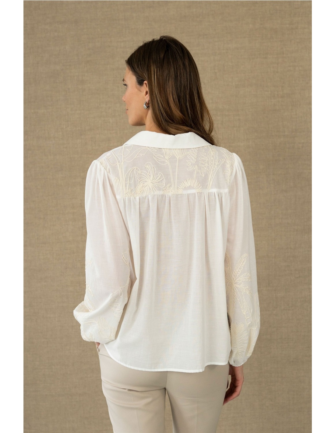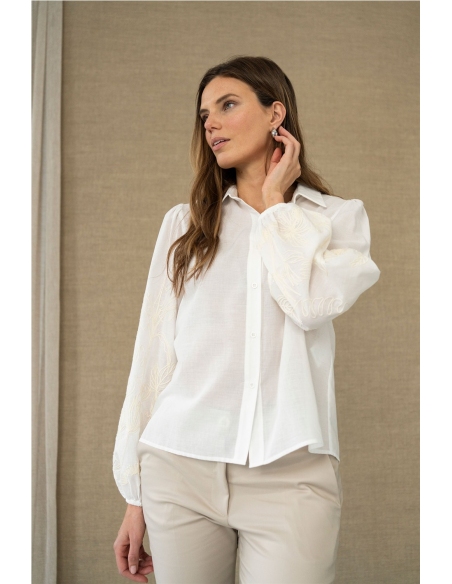 Delicada, luminosa y con un punto romántico. Esta camisa blanca destaca por su tejido ligero y su caída suave, que aporta movimiento y una sensación de frescura al conjunto. Su silueta recta y el largo a la cadera la convierten en una prenda cómoda y fácil de llevar, perfecta para looks de diario cuidados o estilismos más especiales. Los bordados florales en las mangas añaden textura y un detalle artesanal sutil que eleva el diseño sin recargarlo. El canesú trasero con ligero fruncido aporta amp