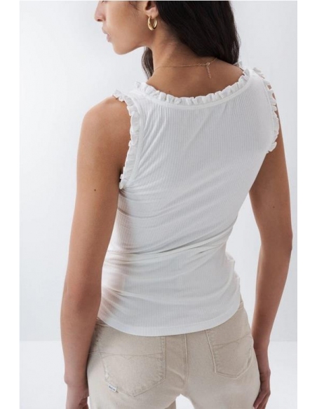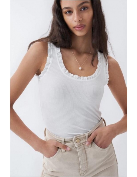 Top de punto canalé. Corte Slim. Escote en U y detalle de volantes en los tirantes y el escote. Blanco liso.