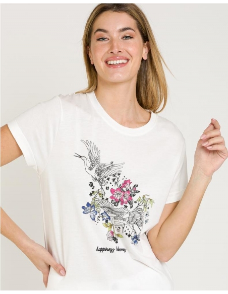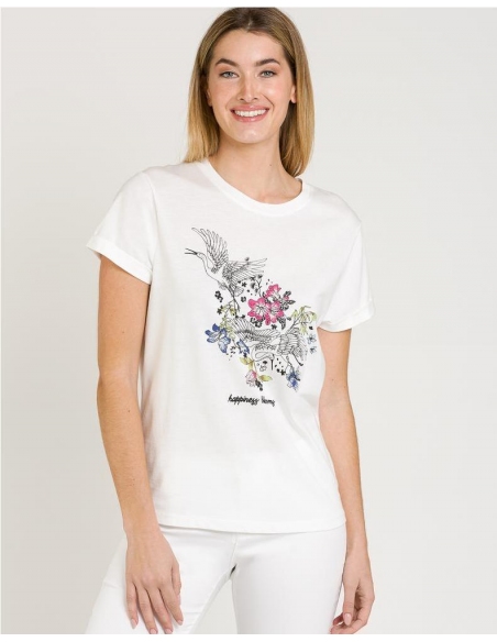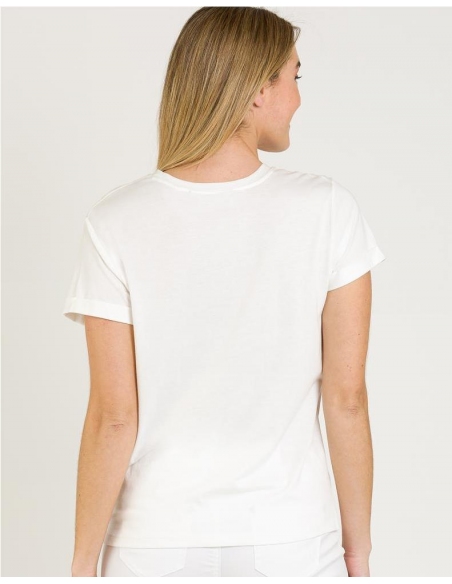 Camiseta mujer manga corta con dobladillo y cuello redondo. Tiene mensaje delantero serigrafiado y detalle de tres botones dorados en forma de corazón en el hombro.