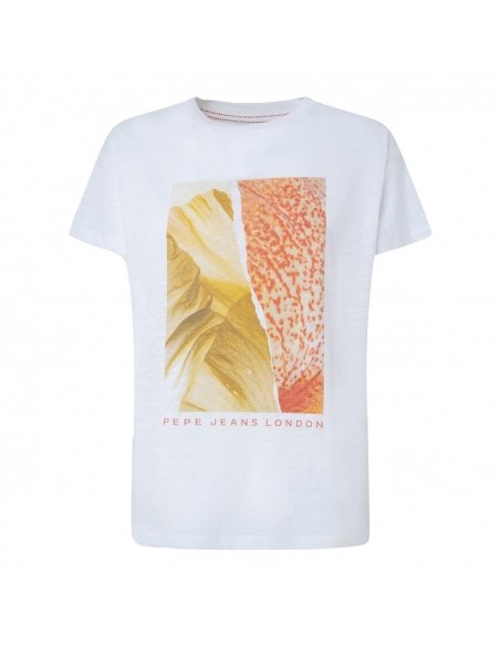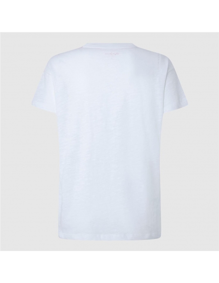 Camiseta en tejido fluido Cuello barco Manga corta Detalles en relieve en estampado Hombros ligeramente caídos Acabado doble pespunte en mangas y bajo Fabricada 100% en algodón sostenible