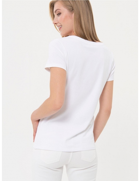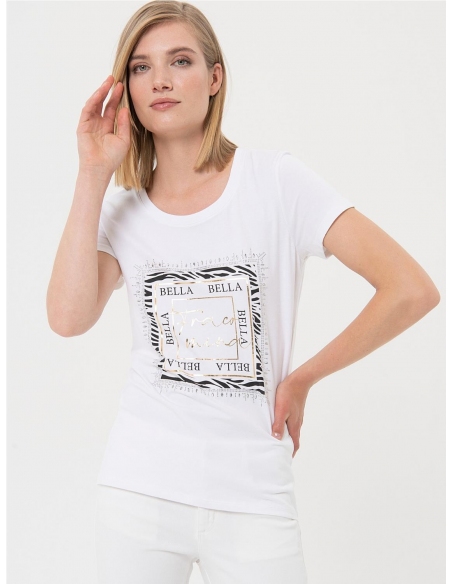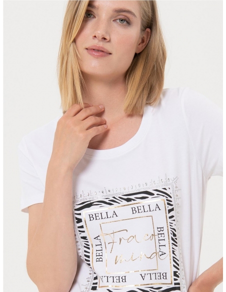 Camiseta regular fit confeccionada en punto. Cuello redondo, dibujo con letras con strass y manga corta. COMPOSICIÓN: ALGODÓN 96% ELASTANO 4%