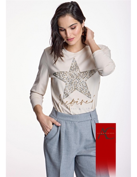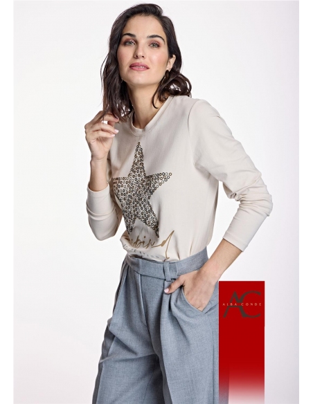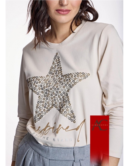Eleva tu estilo cotidiano con esta sofisticada camiseta de Alba Conde. Diseñada con un cuello redondo clásico y manga larga, esta prenda combina a la perfección comodidad y elegancia. El detalle protagonista es una estrella en la parte frontal, realizada meticulosamente con tachuelas, que añade un toque de brillo y distinción. Ideal para un look casual pero refinado, esta camiseta se convierte en un imprescindible de tu armario, aportando un toque chic y moderno a cualquier conjunto.