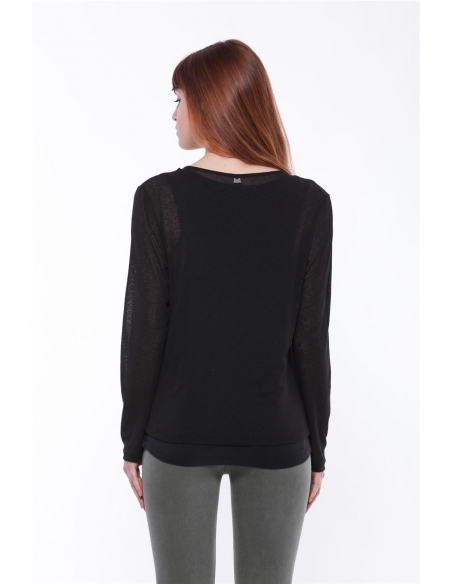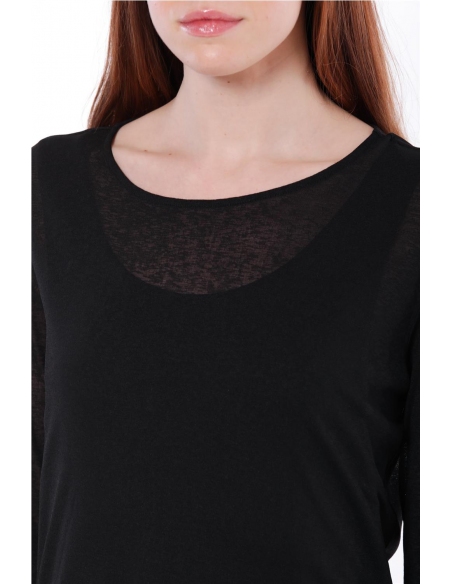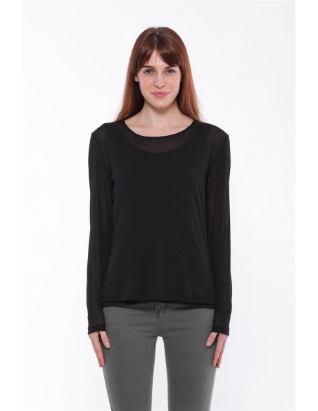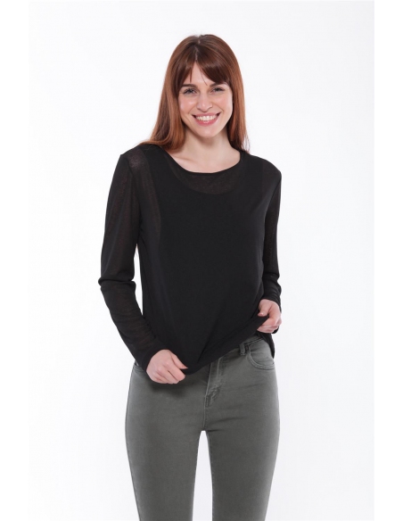Una prenda imprescindible en el armario es la camiseta de doble hilo y tacto ultraligero. Es de corte entallado, escote redondo y manga larga. La parte de abajo es de punto de viscosa. Perfecto también debajo de una chaqueta para entretiempo.