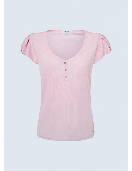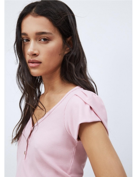 - Camiseta canalé con escote - Manga con volumen - Detalle botones en pecho
