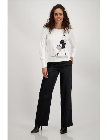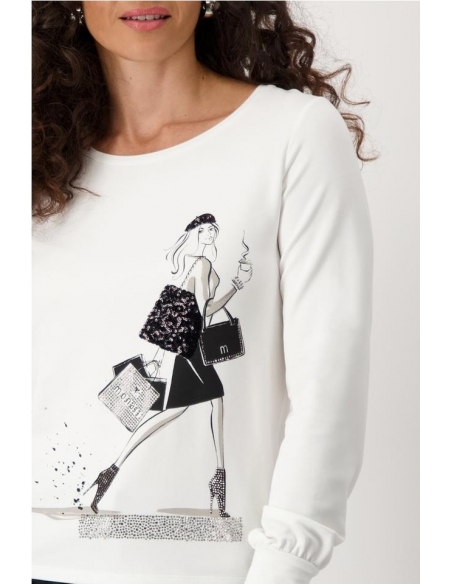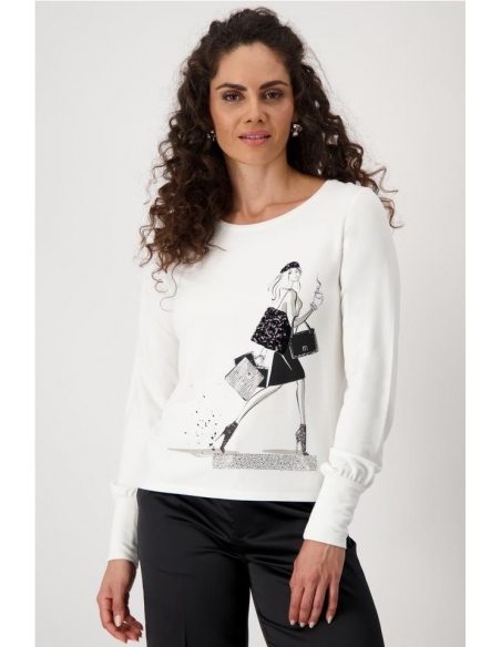 Mezcla de viscosa y modal sostenible EcoVero Material elástico Estampado de mujeres Diamantes de imitación Tacto suave Ajuste regular Escote redondo Mangas largas Puños anchos con frunces