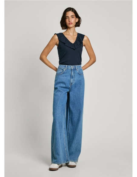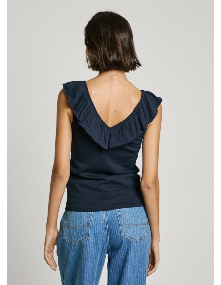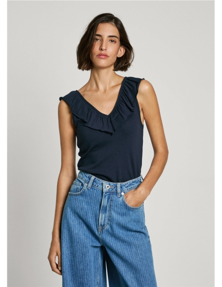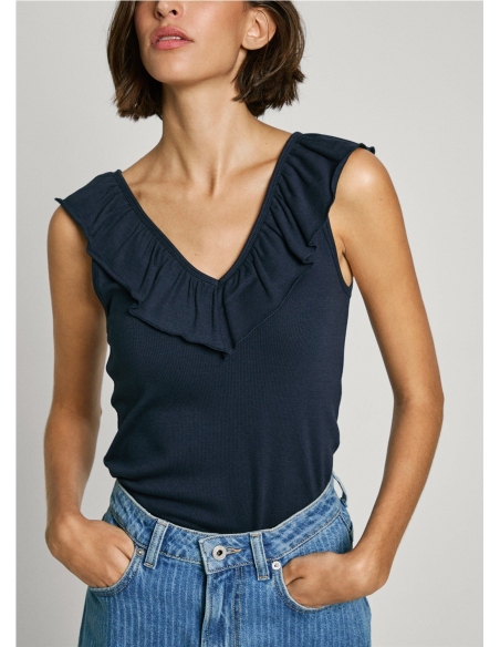 - Top canalé en una mezcla de algodón elástico - Escote en V frontal y en espalda - Volantes de dos capas alrededor del cuello - Sin mangas - Logo tonal PEPEJEANS bordado en bajo - Acabado doble pespunte en bajo - Fabricado con al menos un 50% de algodón sostenible