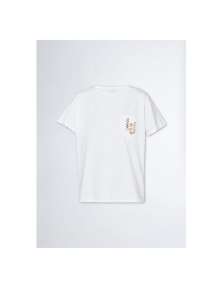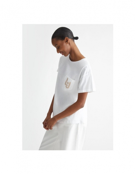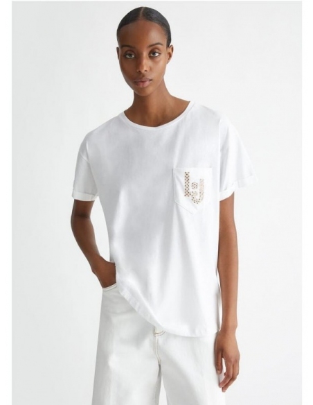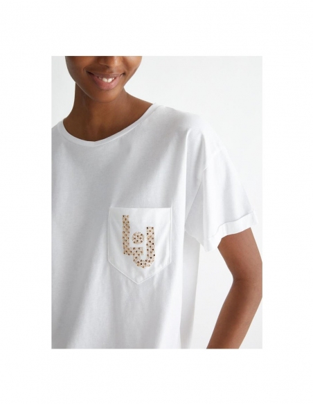 Camiseta blanca Confección en punto de algodón Letras LJ con strass en el pecho Cuello redondo Bolsillo en el pecho Manga corta Producto "Liu Jo Better"