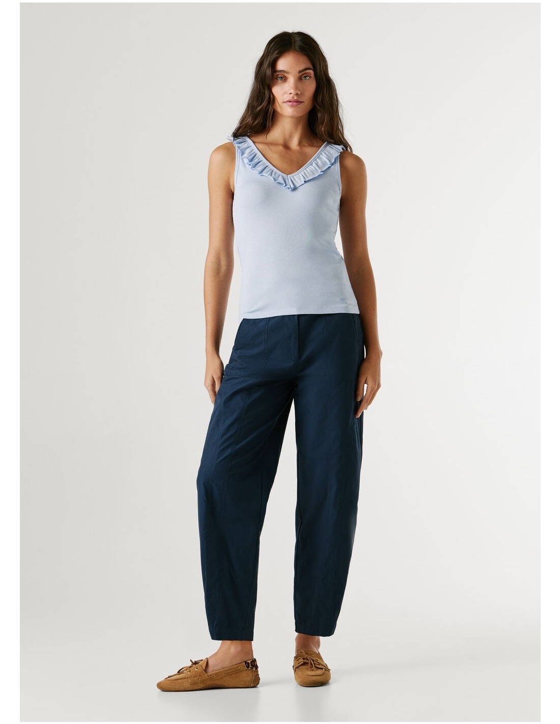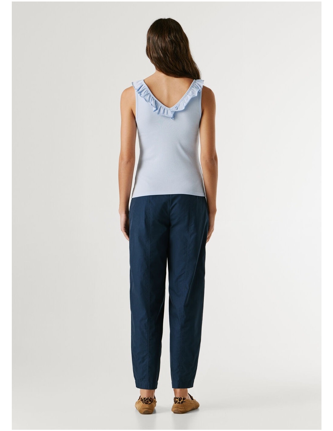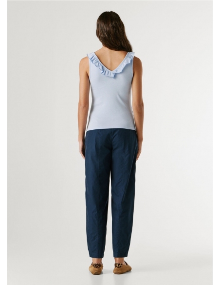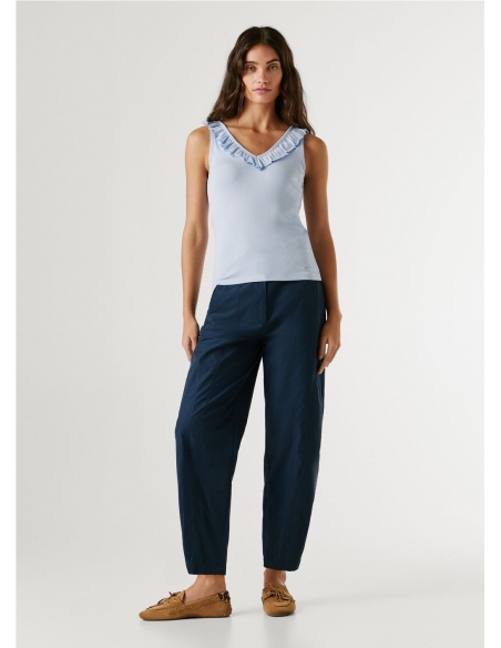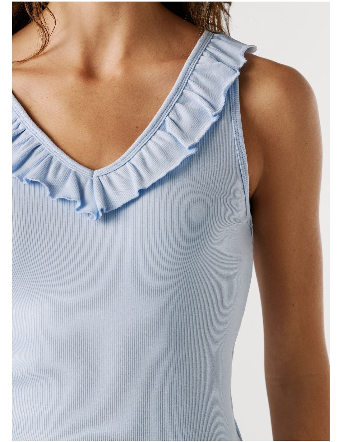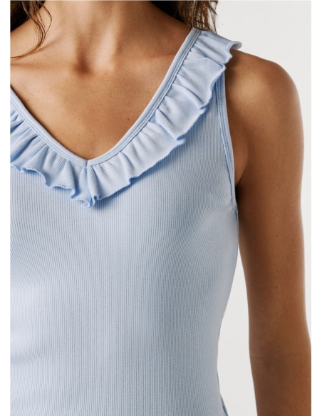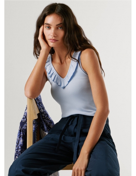 Descripción - Top de punto canalé en una mezcla de algodón elástico - Cuello pico pronunciado en la parte frontal y en la espalda - Volantes de dos capas alrededor del cuello - Diseño sin mangas - Logo PEPEJEANS a tono bordado al lado izquierdo del bajo - Cuello y sisas con detalle canalé y rematados con doble costura - Acabado doble pespunte en el bajo