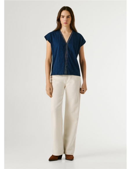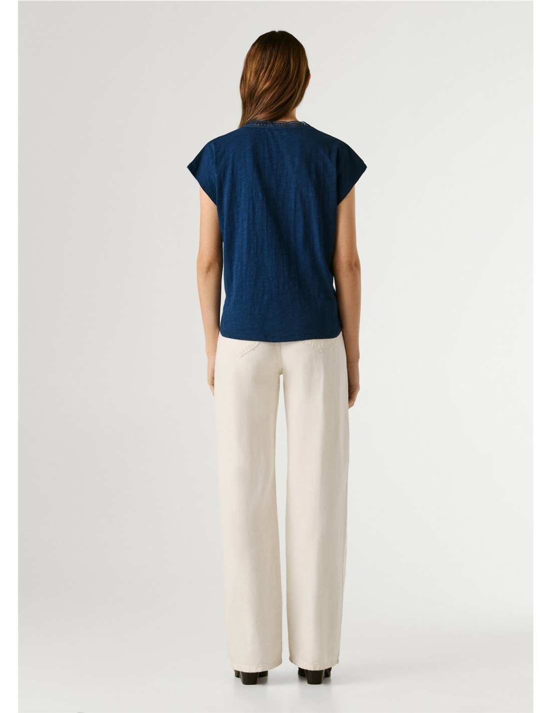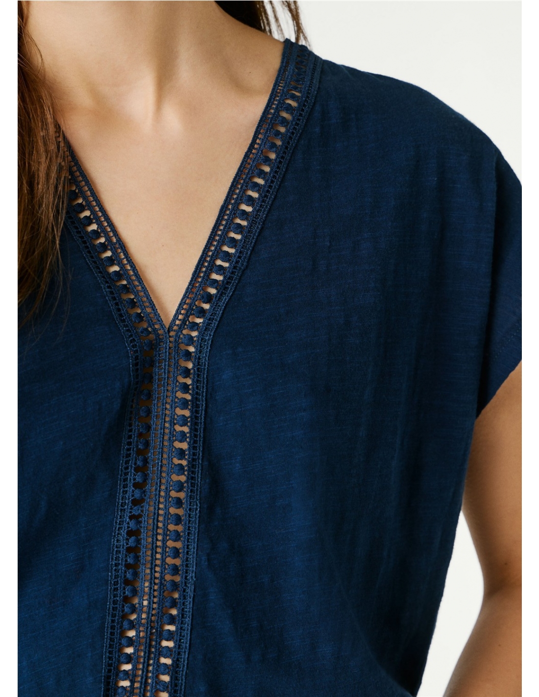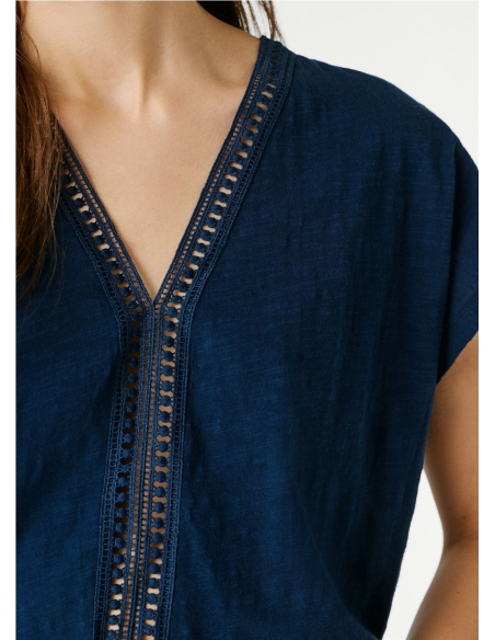 - Camiseta en tejido jersey jaspeado - Manga corta - Color liso - Cuello pico con cinta calada decorativa - Cinta calada decorativa en la parte frontal desde el escote hasta el bajo - Acabado doble pespunte en mangas y bajo - Fabricada 100% en algodón