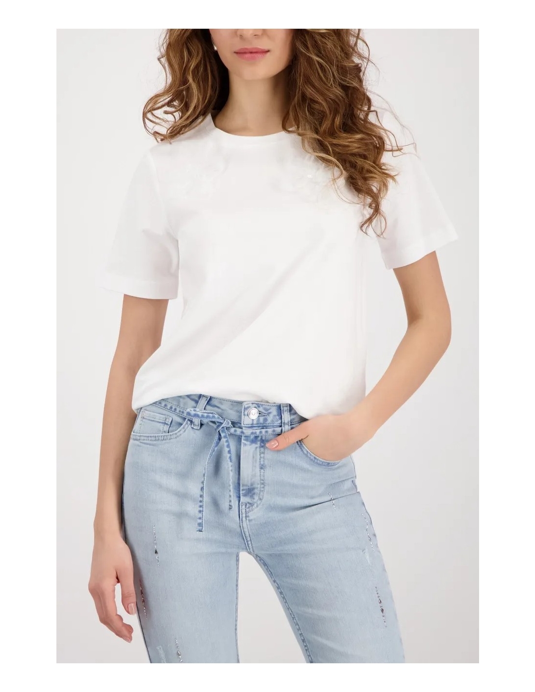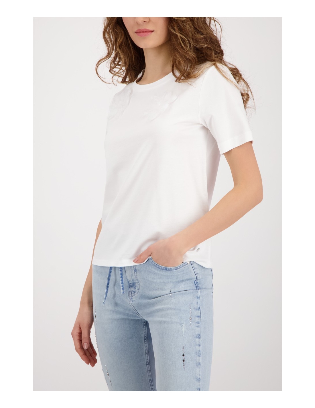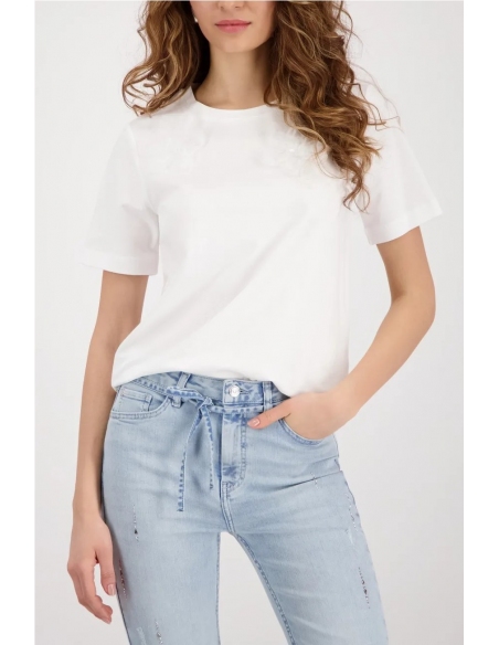 Elegante camiseta con flores en 3D, confeccionada en algodón y modal de alta calidad, con interior de felpa, cuello redondo y mangas cortas.