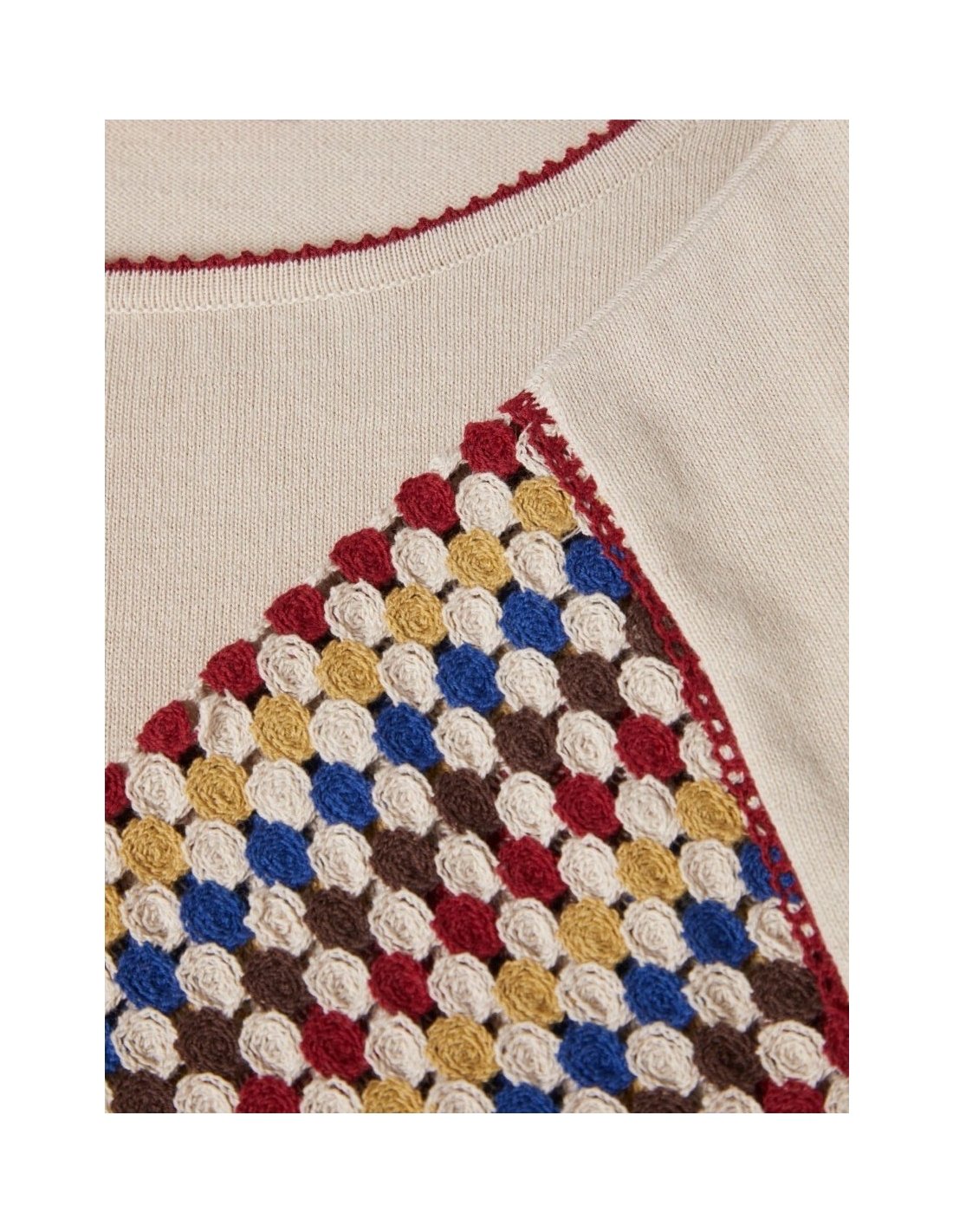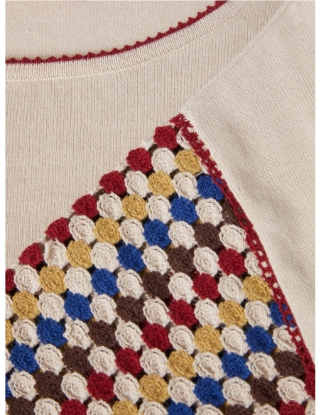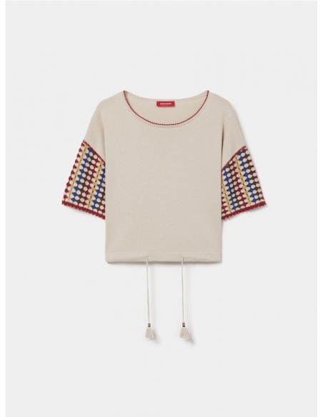 Camiseta de manga corta confeccionada en punto de algodón con efecto ganchillo. Destaca por las mangas multicolor y el cuello de punto en contraste. Presenta un bajo ajustable con cordón y acabados de flecos, aportando un toque artesanal y relajado a la prenda.