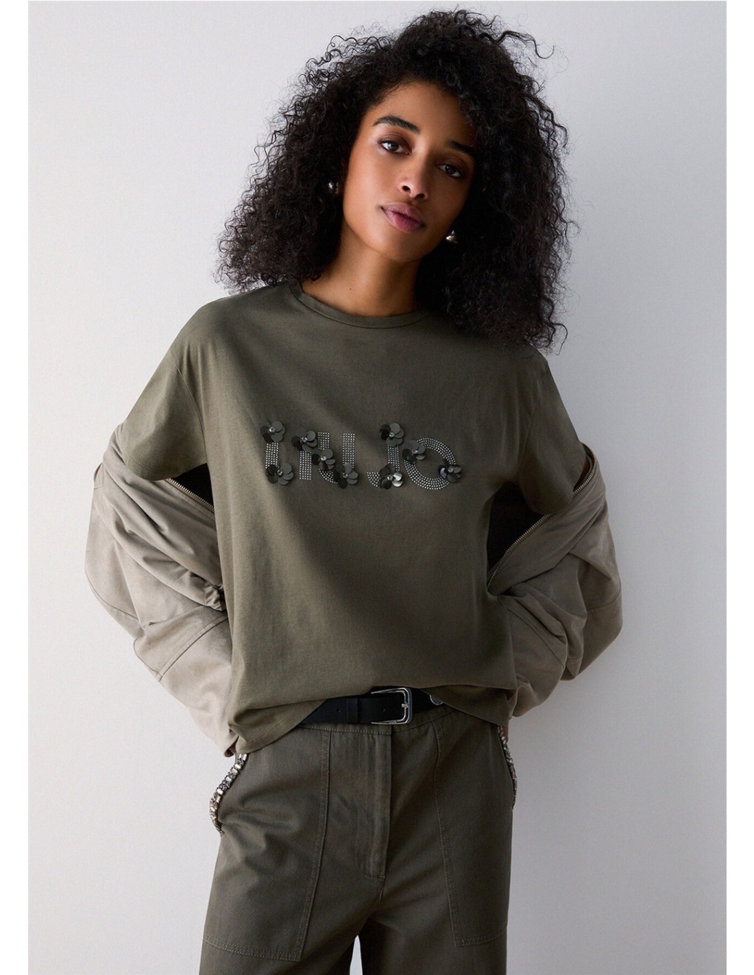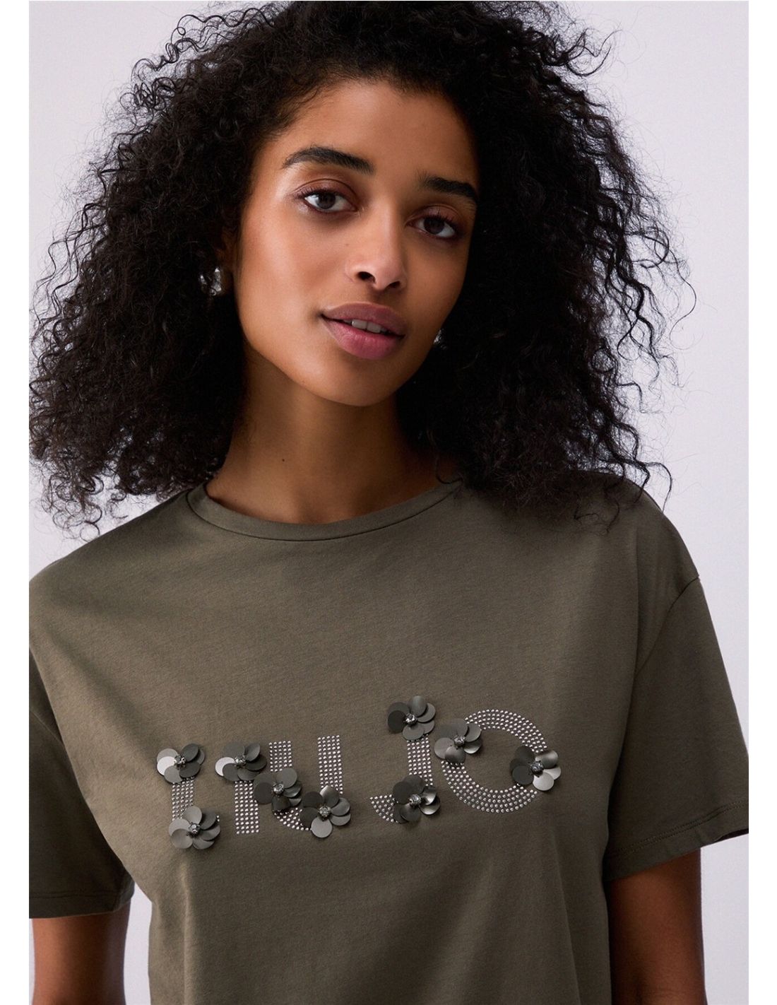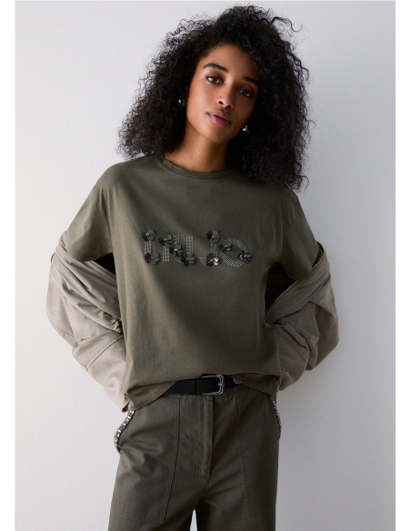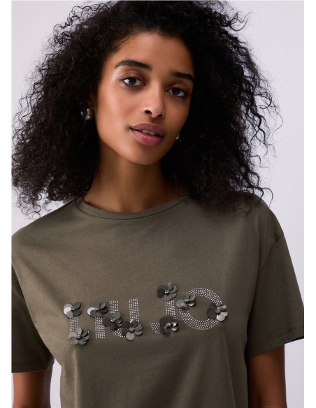 Camiseta de tejido de punto de algodón Cuello redondo Manga corta Estampado y aplicaciones joya Producto "Liu Jo Better"