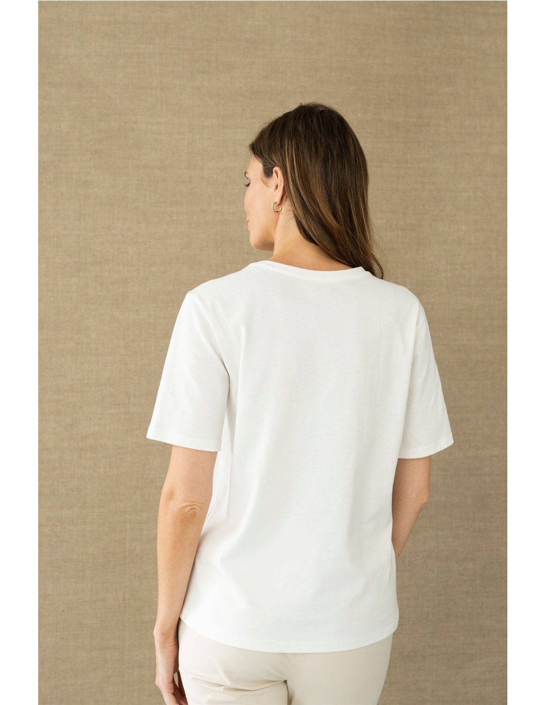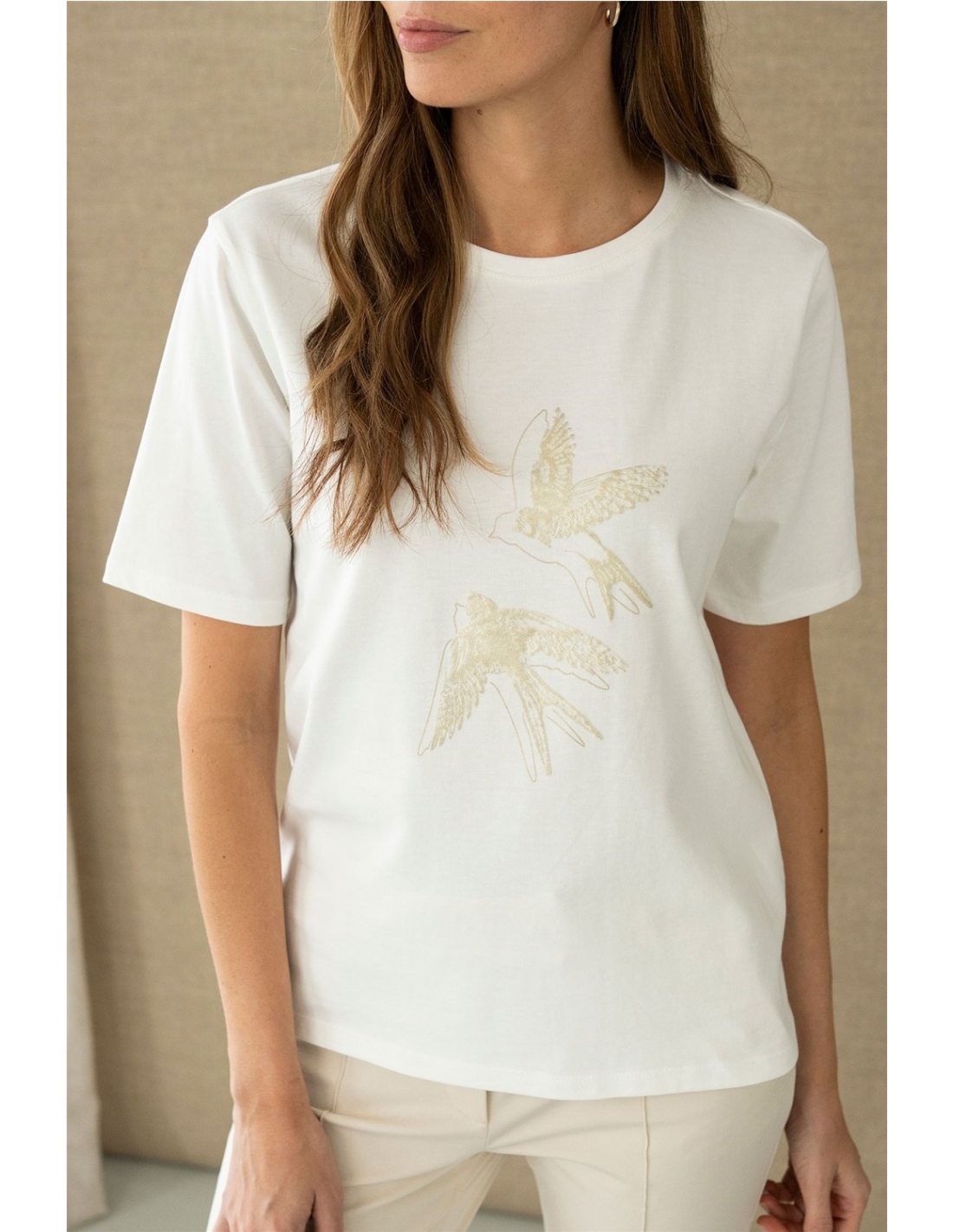Una camiseta blanca de algodón de líneas limpias y espíritu delicado, pensada para sumar un toque especial a tus looks del día a día. El estampado de golondrinas en el frontal aporta un aire poético y sutil, que eleva la prenda sin perder su carácter atemporal. Su corte recto y el cuello redondo la convierten en una pieza fácil de combinar, perfecta tanto con pantalones fluidos como con vaqueros o faldas. Una camiseta versátil que funciona como fondo de armario con un detalle que marca la difere