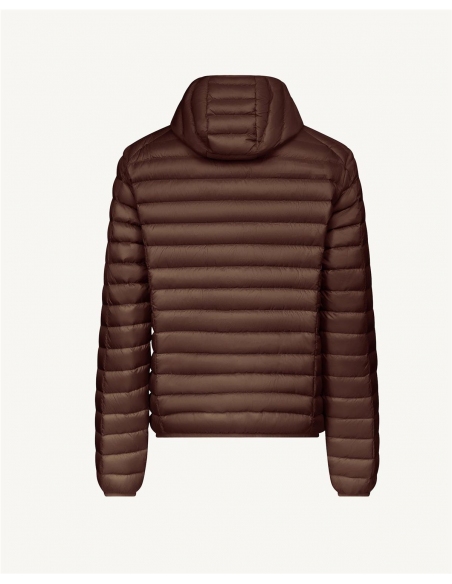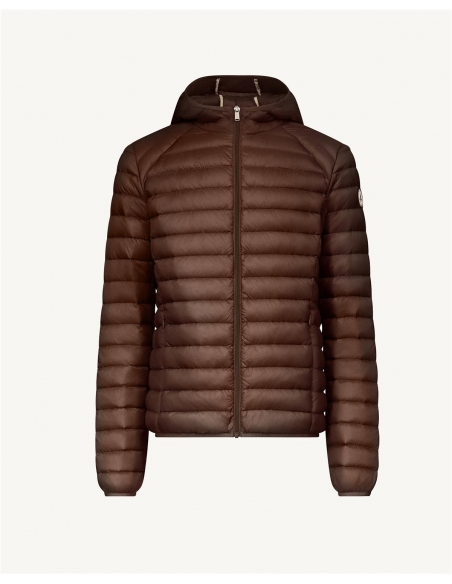 Tejido acolchado satinado repelente al agua Relleno de plumas y plumón con certificación RDS Corte entallado Capucha 2 bolsillos laterales invisibles Costuras interiores en color de contraste Logotipo original de fieltro en la manga izquierda