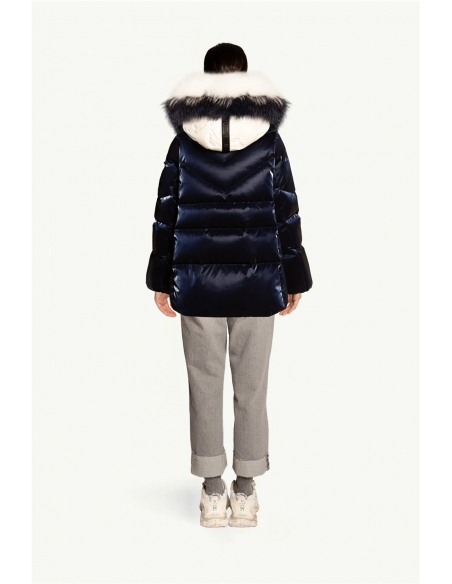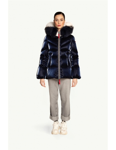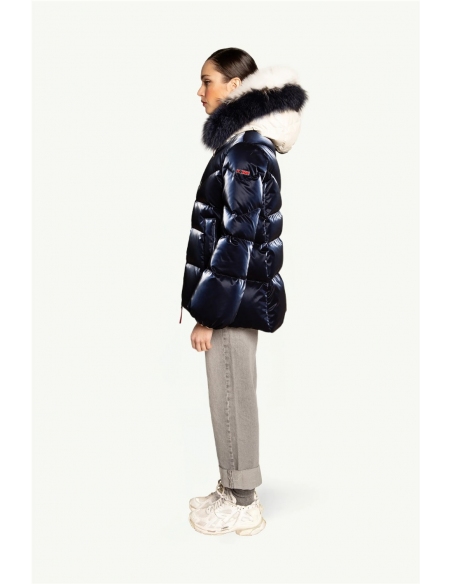 Luce un invierno con estilo gracias a este plumífero acolchado en tono azul marino, con acabado brillante y diseño moderno. Su capucha envolvente, adornada con pelo natural de alta calidad en contraste blanco y gris, aporta un toque cómodo y extra de calidez. Con cierre de cremallera y bolsillos laterales, es ideal para combinar moda y comodidad tanto en la ciudad como en escapadas invernales.