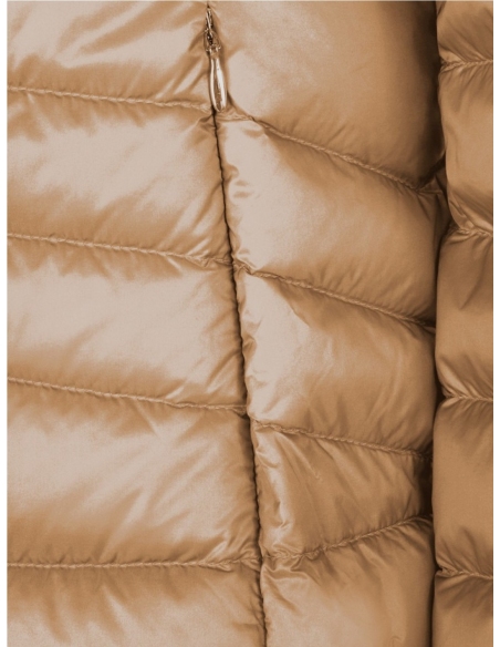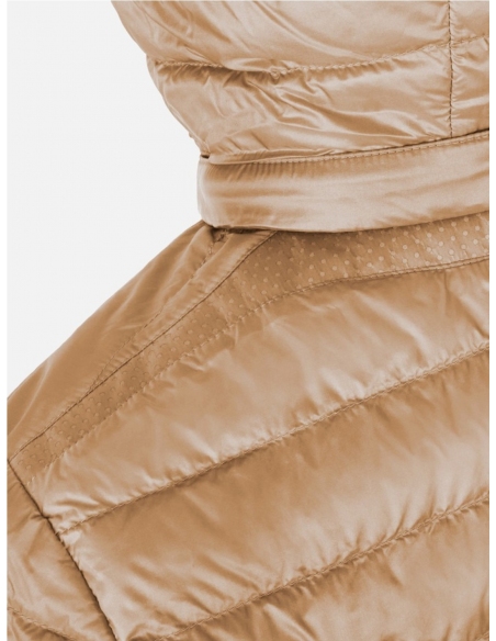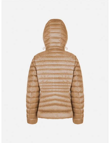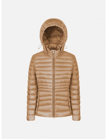 Plumífero para mujer de corte entallado con capucha desmontable, que combina una extrema ligereza y un diseño contemporáneo perfecto para usar en entretiempo. Este modelo, de un cálido color arena, ha sido realizado con nailon reciclado ultraligero, cortaviento y repelente al agua con relleno de plumón natural de alta calidad.