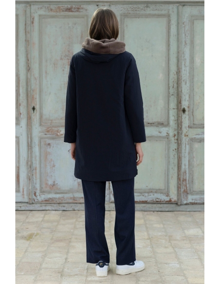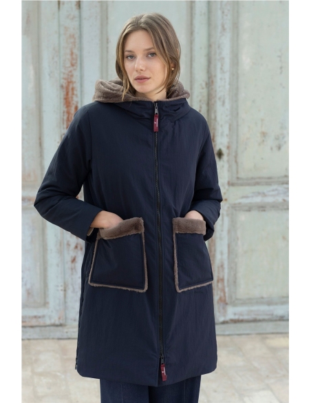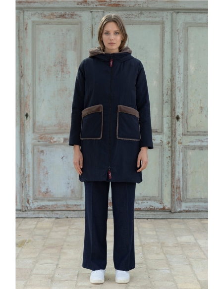 Abrígate con estilo gracias a esta parka de mujer en azul marino, diseñada para ofrecer máximo confort en los días fríos. Su capucha forrada en suave pelo marrón y sus bolsillos frontales con detalle de pelo aportan un toque elegante y acogedor. El tejido, junto con su corte recto y moderno, la convierten en una prenda ideal para el invierno urbano. El cierre central con cremallera de doble carro y los bolsillos amplios y prácticos aseguran comodidad y funcionalidad en todo momento.