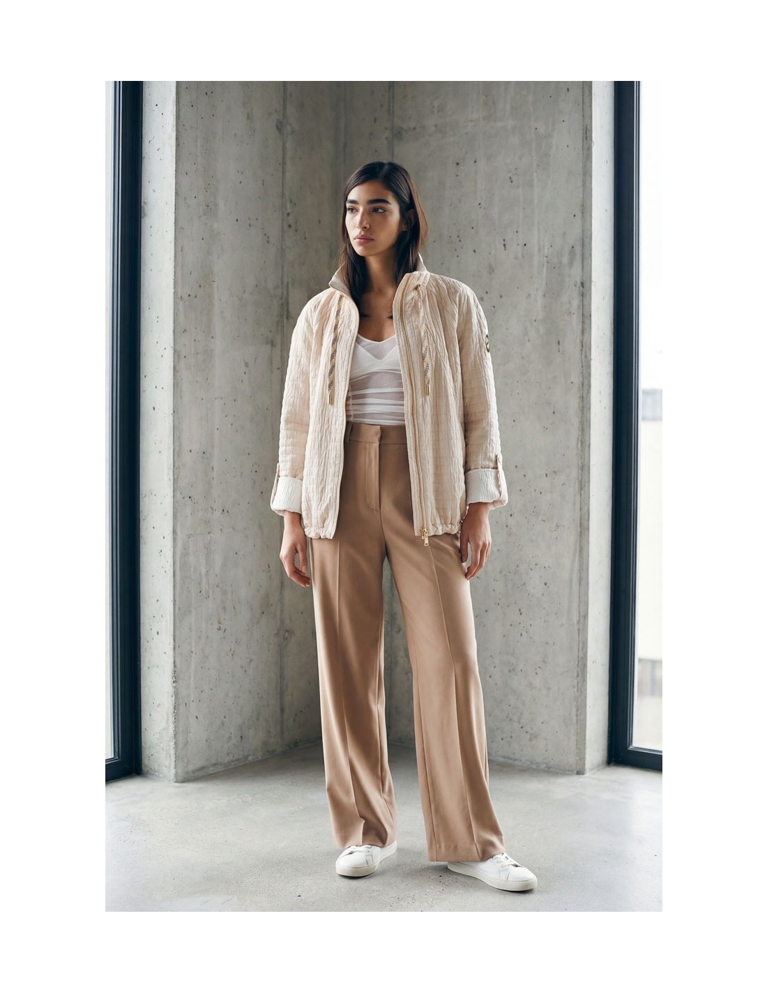 Chaqueta de corte holgado y confeccionada en tejido ligero, con cuello, manga larga y bolsillos laterales. Cierre de cremallera central.