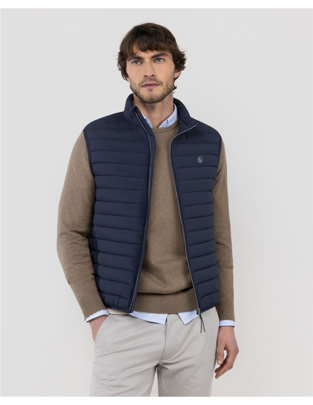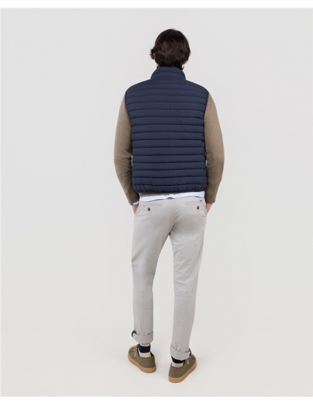 Chaleco de hombre acolchado confeccionado en nylon reciclado, repelente al agua. Cuenta con cremalera y sisa elástica para mayor comodidad. Dispone de bolsillos frontales con cremallera y un bolsillo interior adicional. El logo, con acabado engomado, ubicado en el pecho.