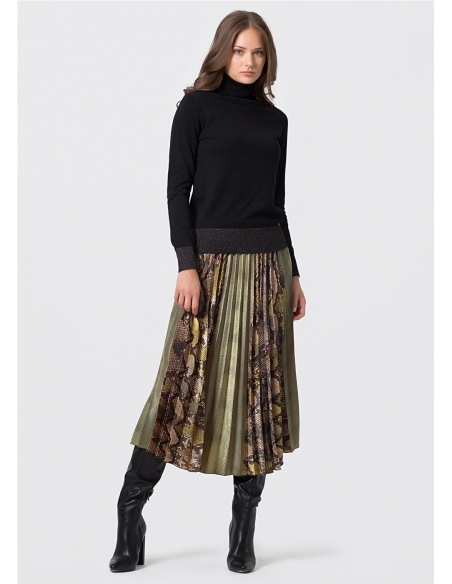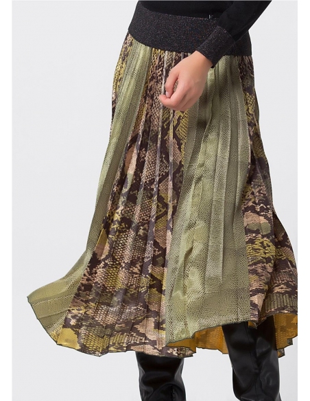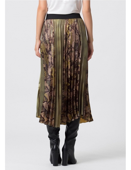 Falda de Kocca modelo MONUT en tejido fluido con print animal en tonos verdes y negros. Corta midi con cinturilla elástica en negro. COMPOSICION : 100% VISCOSA