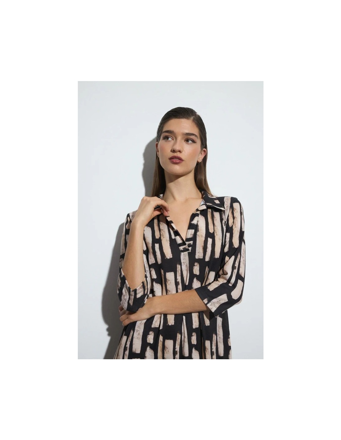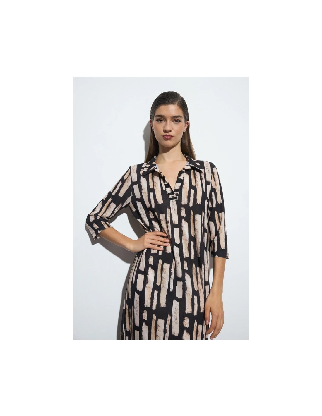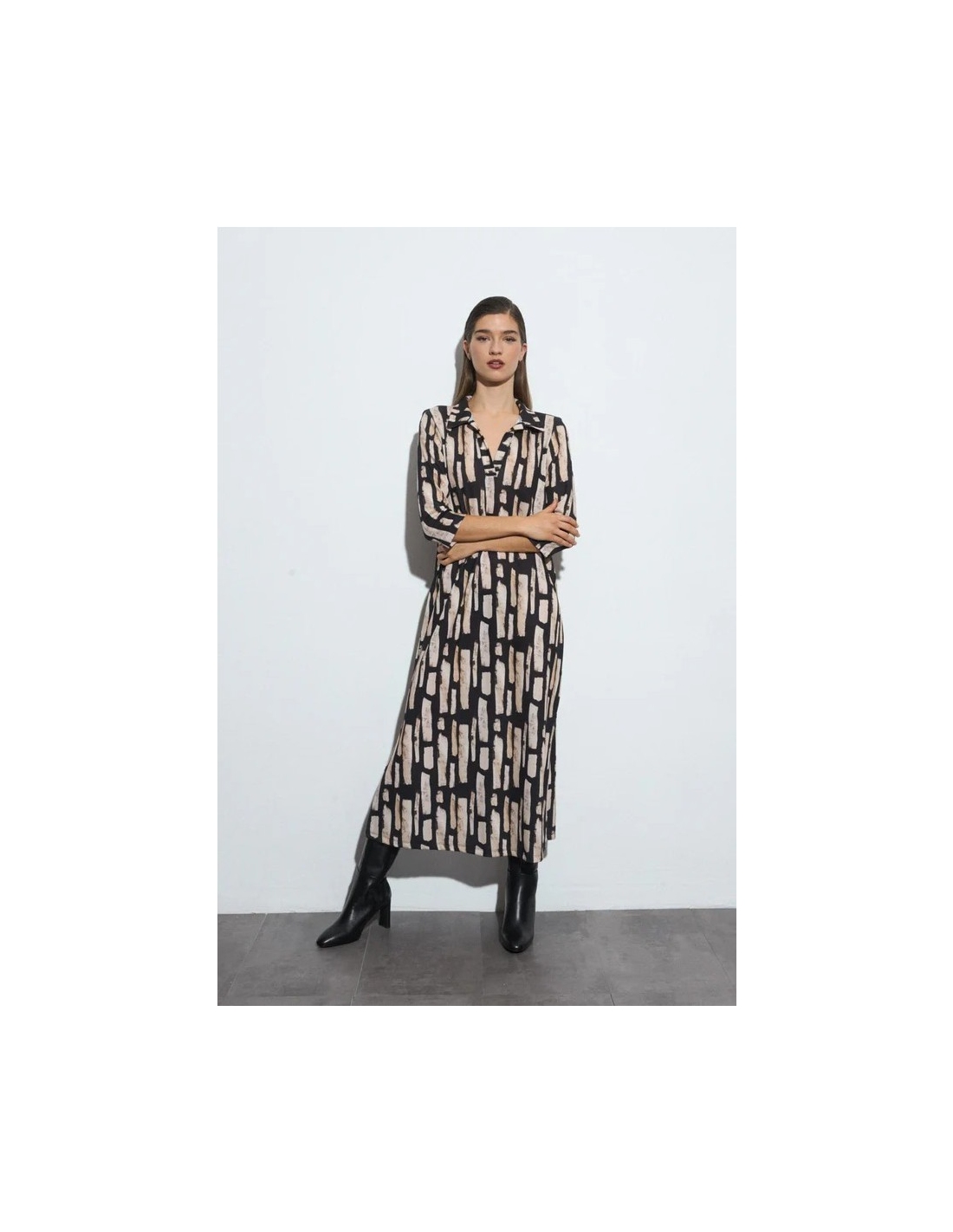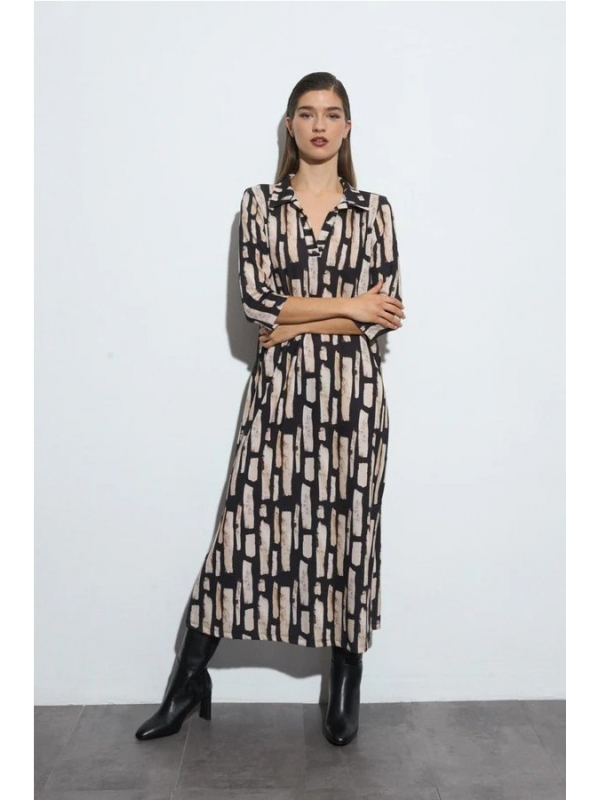 Vestido largo estampado. Diseño recto. Cuello camisero con escote de pico. Manga tres cuartos. Bajo recto. Diseñado y fabricado en España.