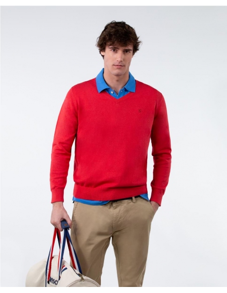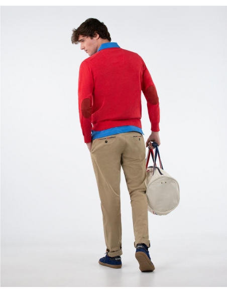 Jersey confeccionado con hilo 100% algodón orgánico. Corte Regular Fit, cuello de pico, coderas de antelina y manga larga acabada en rib. Logo bordado en el pecho. La media luna interior lleva tejido camisero de rayas y detalle corbatero.