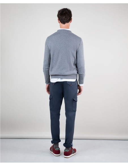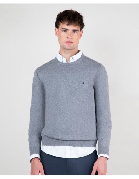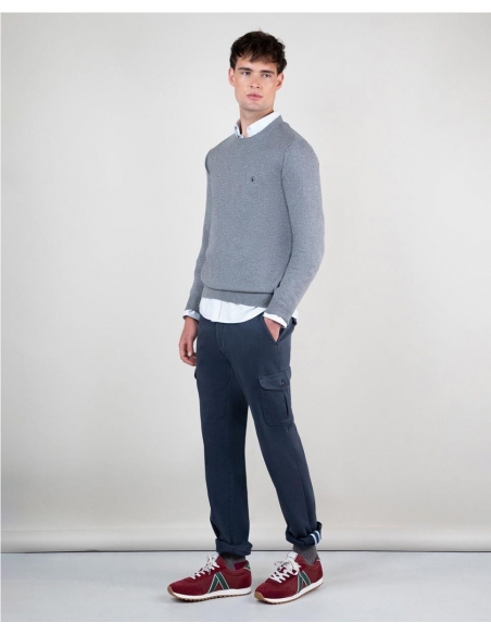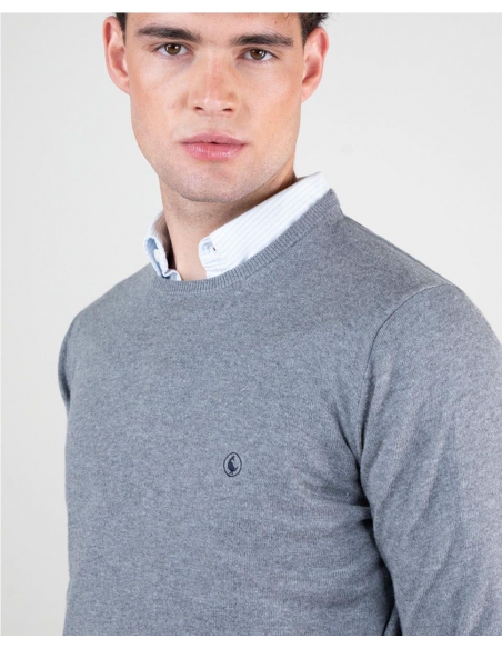 Jersey liso de hombre, fabricado en mezcla de algodón y cashmere para conseguir una calidad con mayor suavidad. Corte Regular Fit, cuello de pico y manga larga. Logo bordado en el pecho y coderas de antelina a tono Cuenta con una media luna interior de te